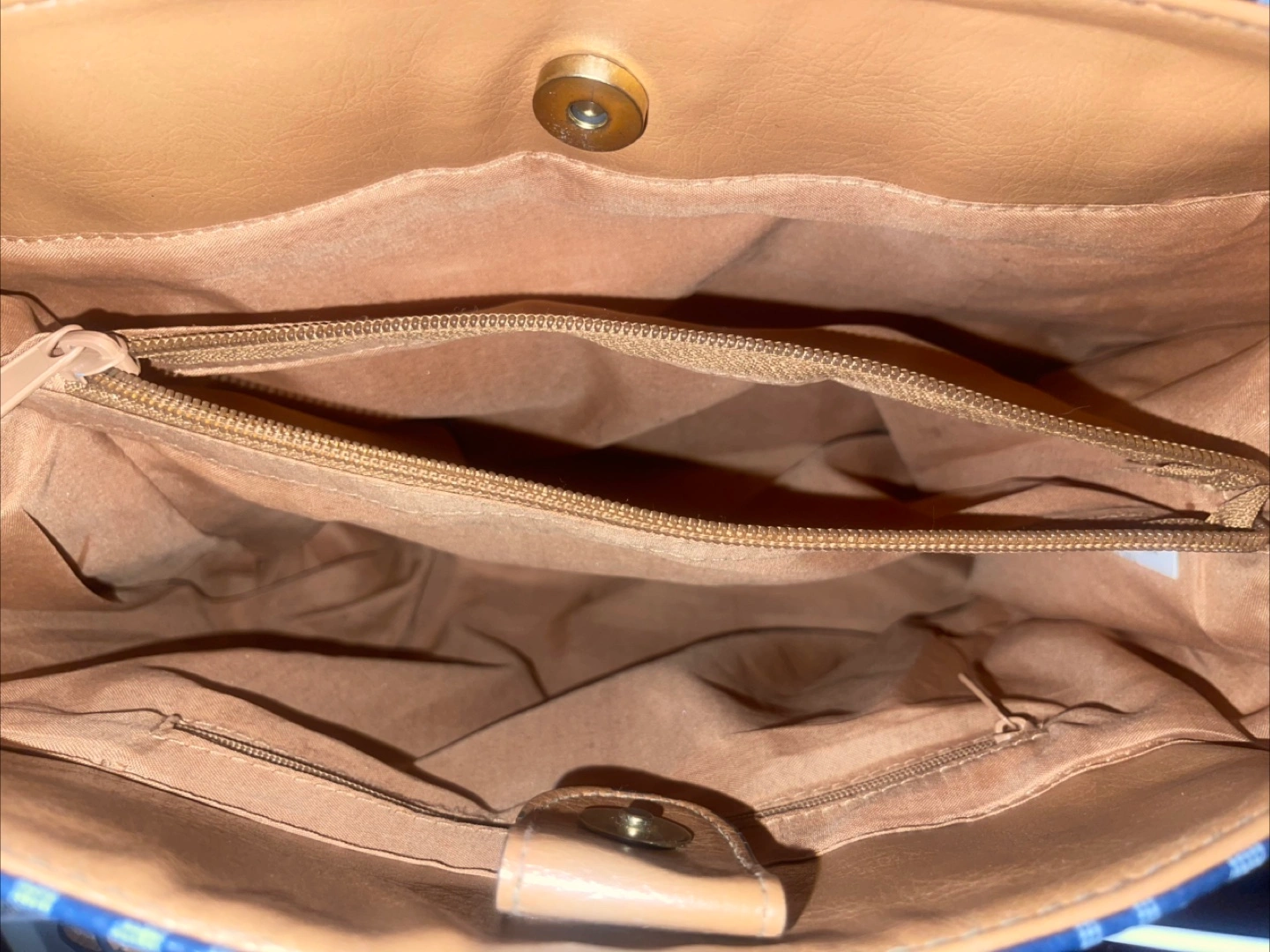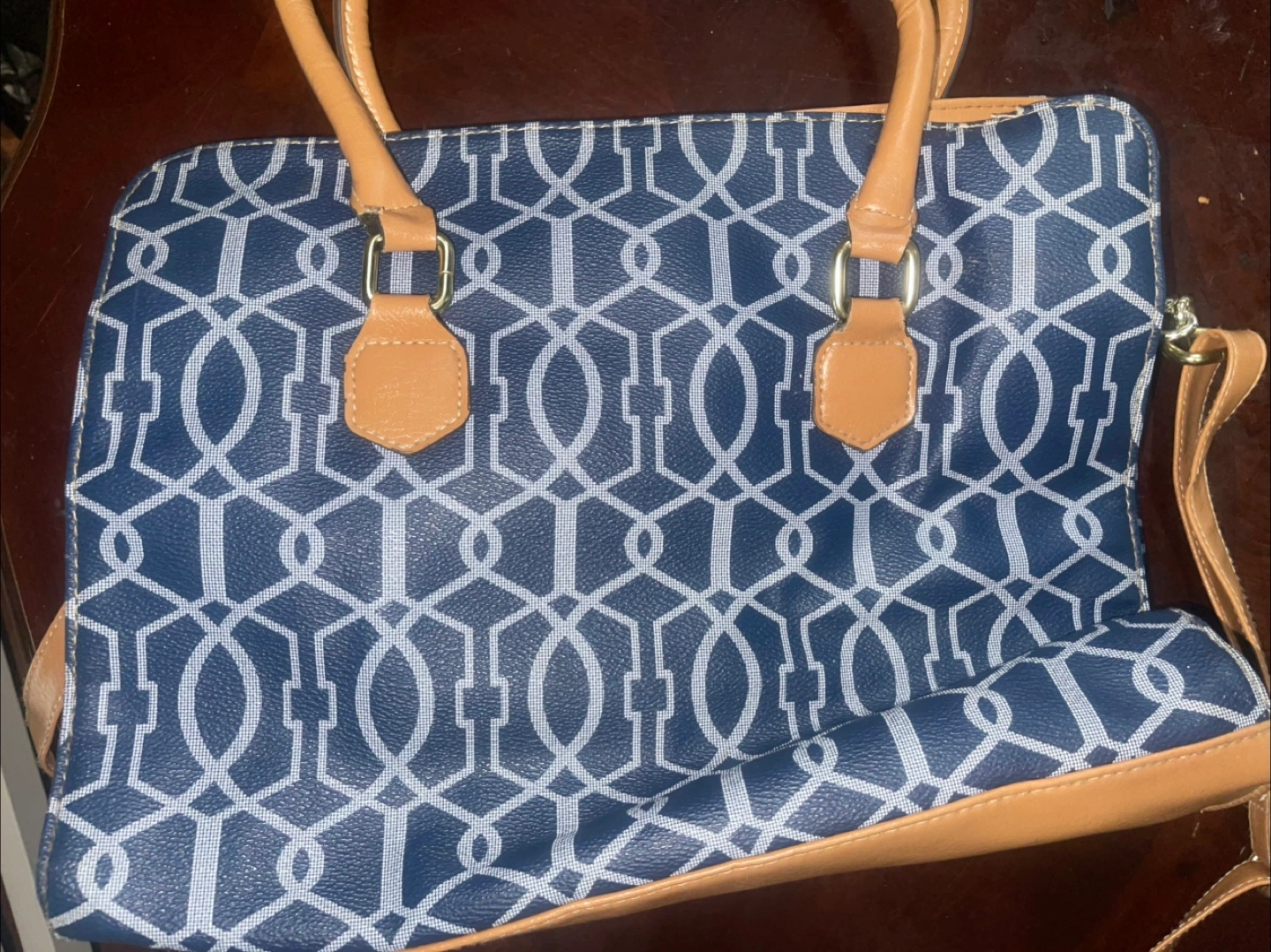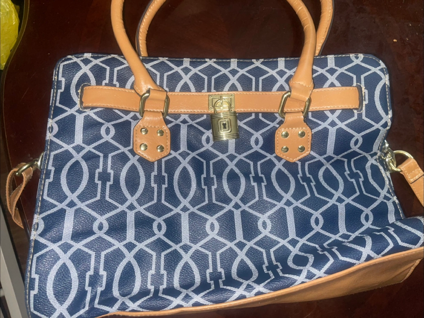 I'm selling a lovely handbag with a blue and white geometric pattern and tan accents. It has a secure lock detail and multiple interior compartments, including zippered pockets, to keep your belongings organized. It's in great condition and ready for a new home!