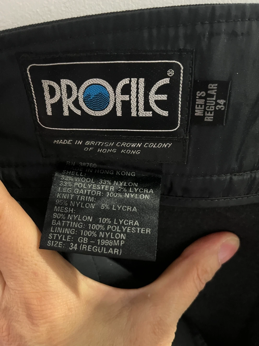 Profile brand ski pants. Shell: 33% Wool, 33% Nylon, 33% Polyester, 2% Lycra. Leg Gaitor: 100% Nylon. Knit Trim: 95% Nylon, 5% Lycra. Mesh: 90% Nylon, 10% Lycra. Batting: 100% Polyester. Lining: 100% Nylon. Style GB-1998MP. Size 34 Regular.