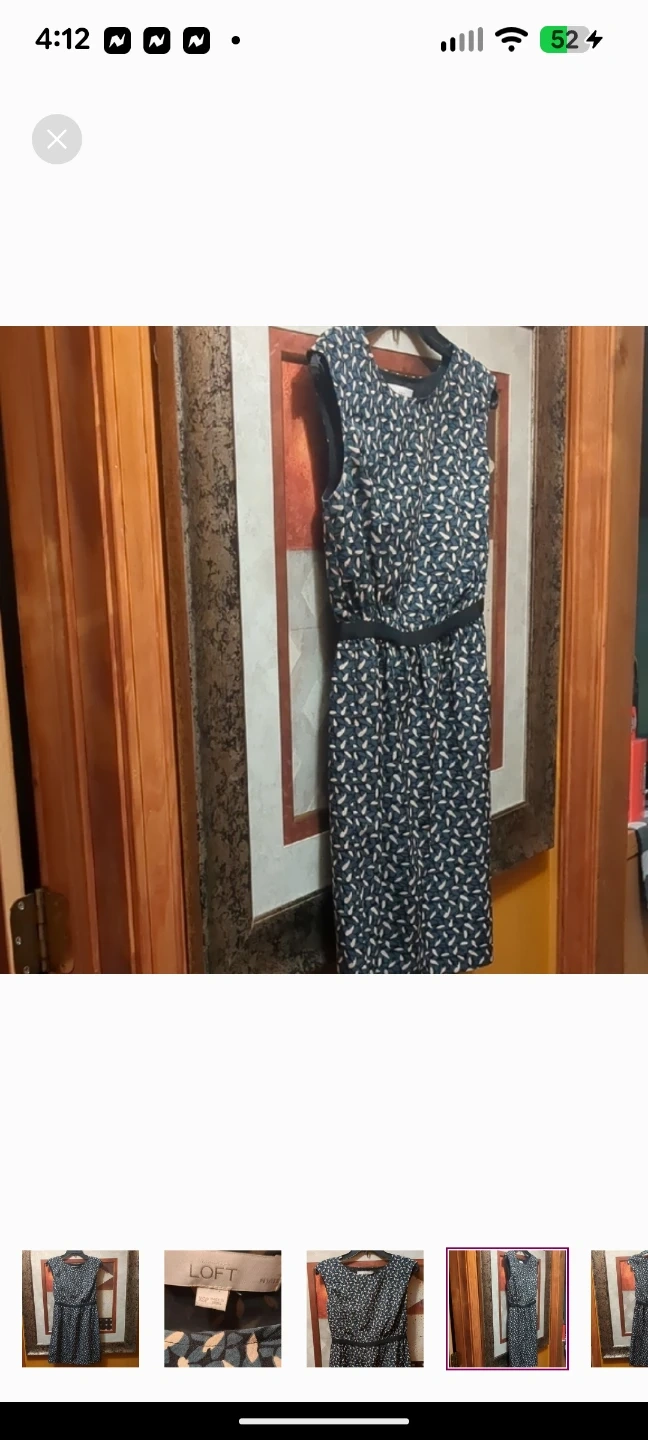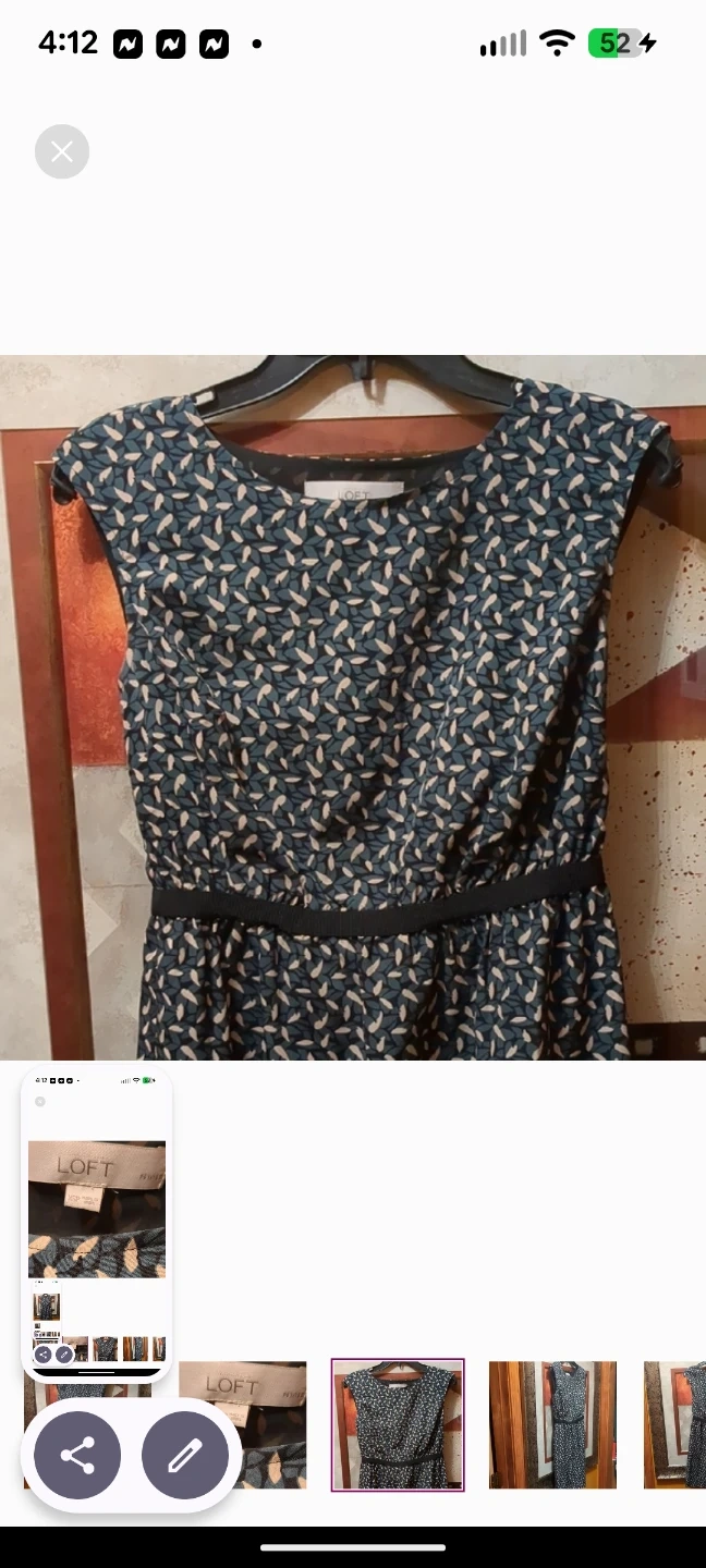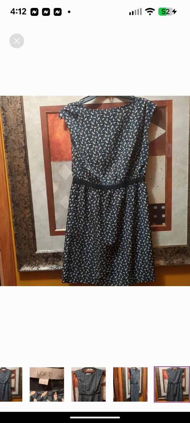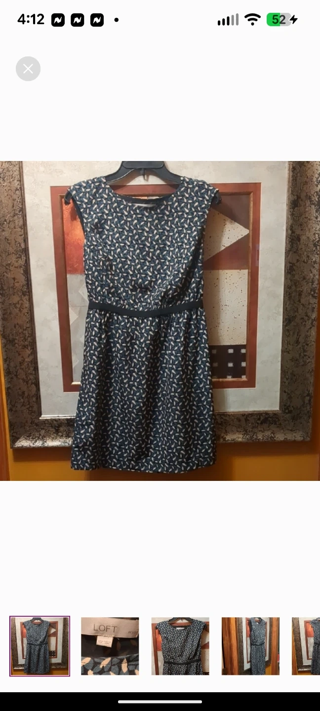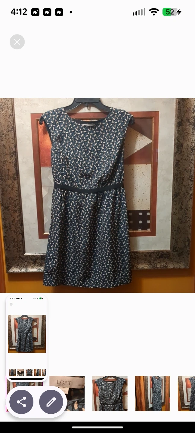 This LOFT dress showcases a chic A-line design with flutter cap sleeves and a crew neckline. The black and gray pattern exudes elegance, perfect for both casual and cocktail settings. A black sash accentuates the waist, adding a refined touch to its overall appeal.