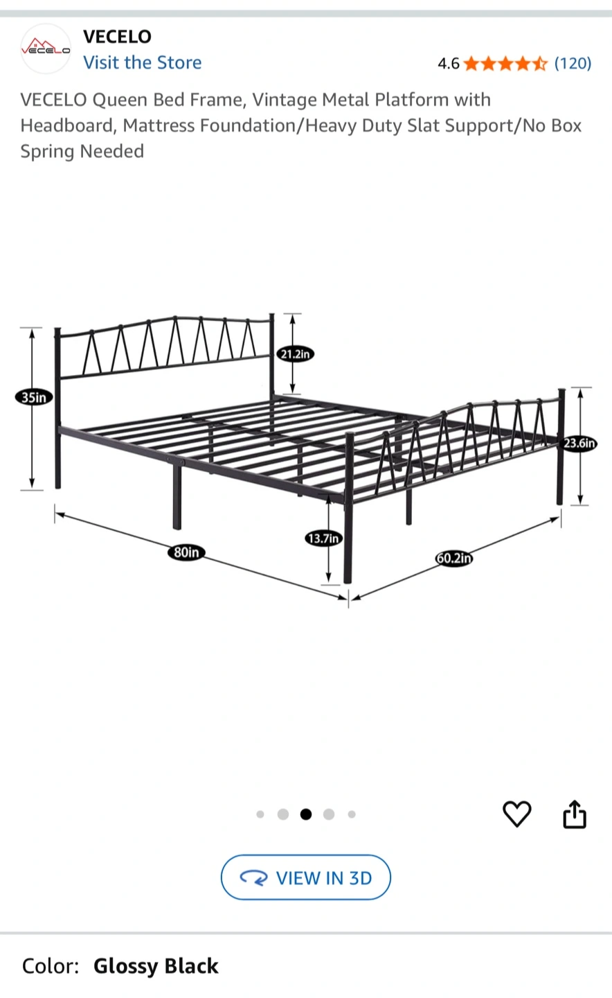 78Selling a VECELO Queen Bed Frame in glossy black! It's a vintage metal platform bed frame with a headboard. It has heavy slat support, so no box spring is needed. The dimensions are approximately 80 inches long and 60.2 inches wide, with a headboard height of 35 inches.