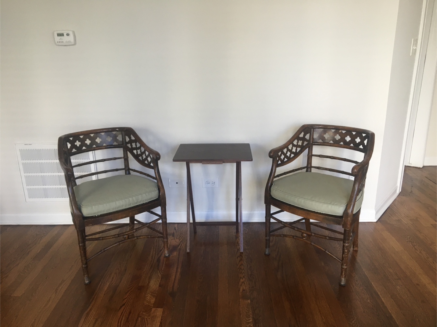 Vintage bamboo chairs with cane seating and sage green cushions. Can include the folding tray table