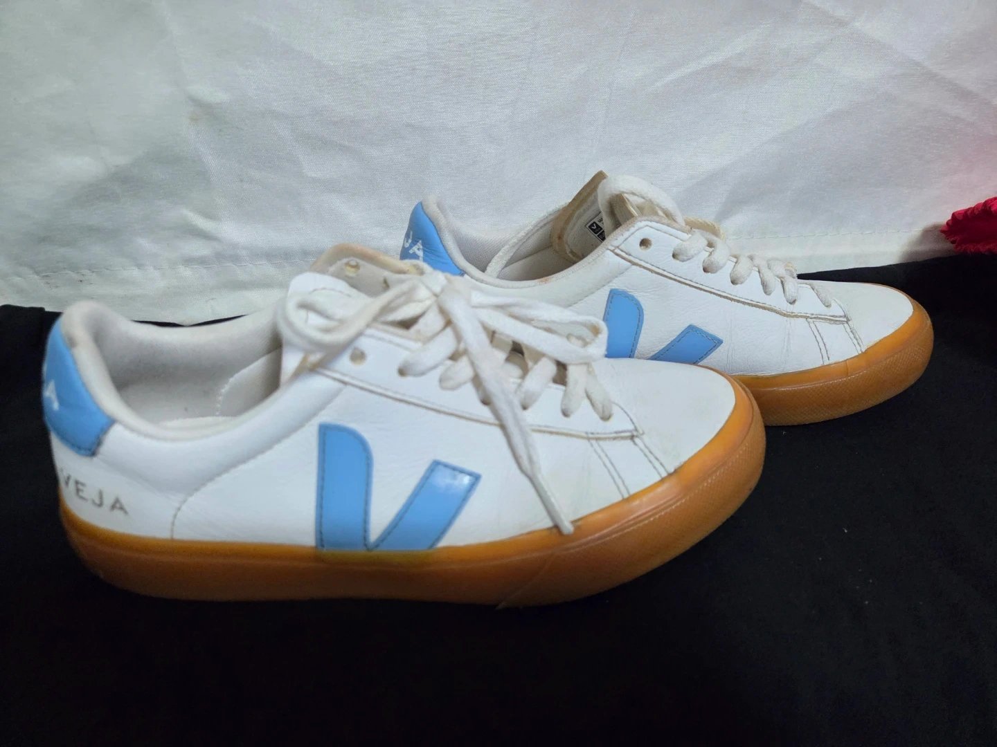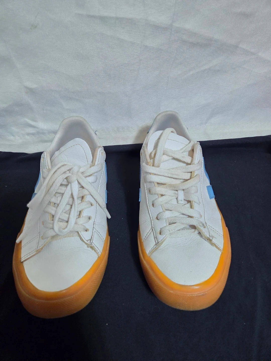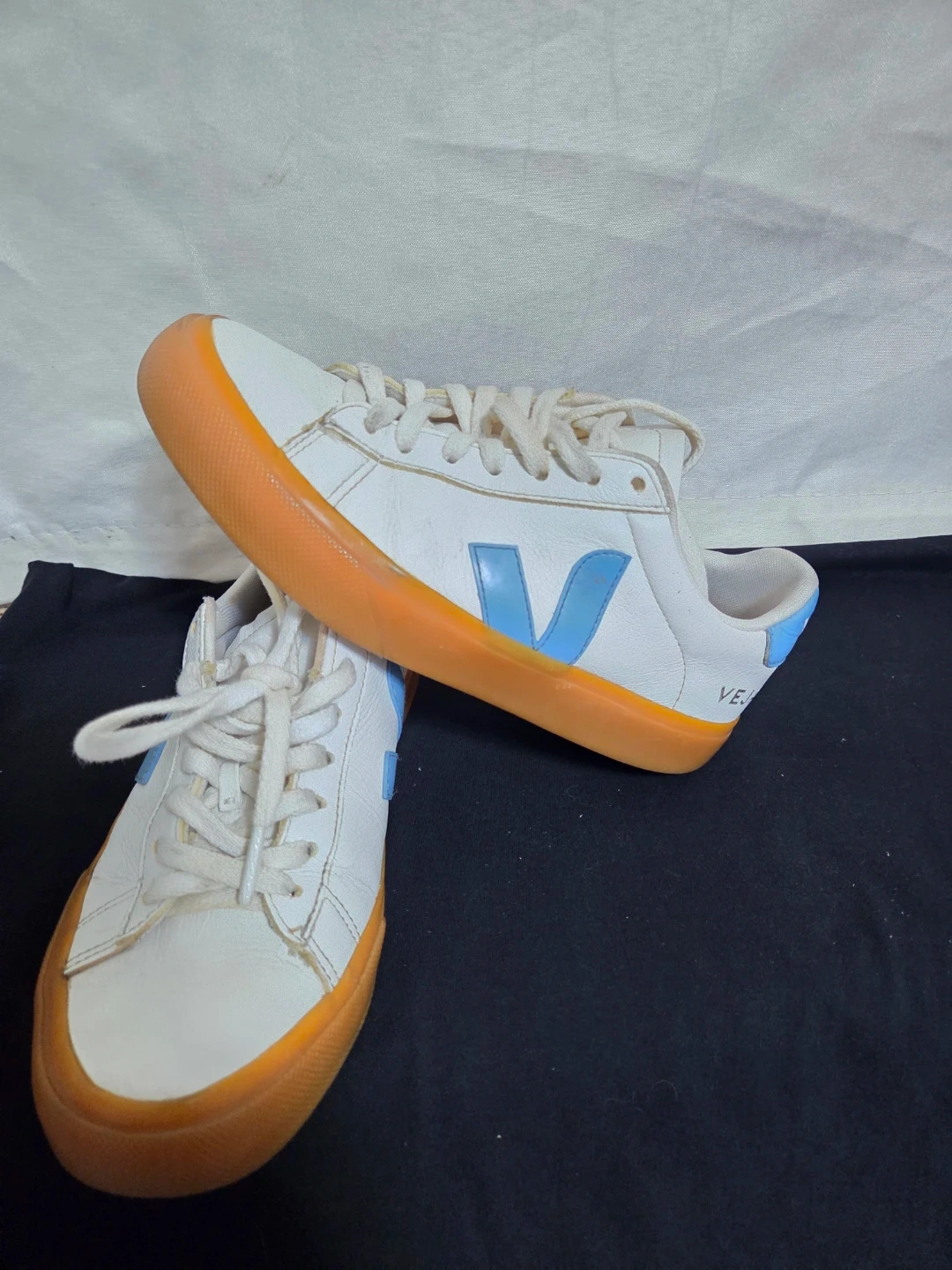 10Selling a pair of Veja Campo sneakers in white with blue accents. They're in good condition and ready for a new home! These stylish and comfortable sneakers are perfect for everyday wear. The size is US 8.