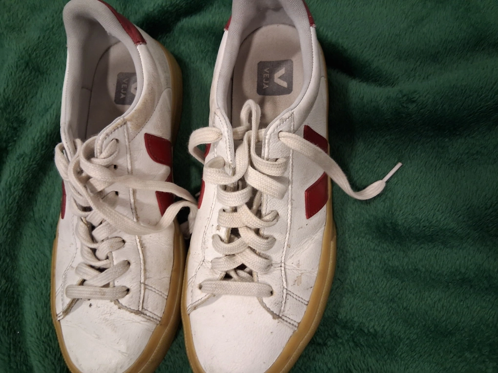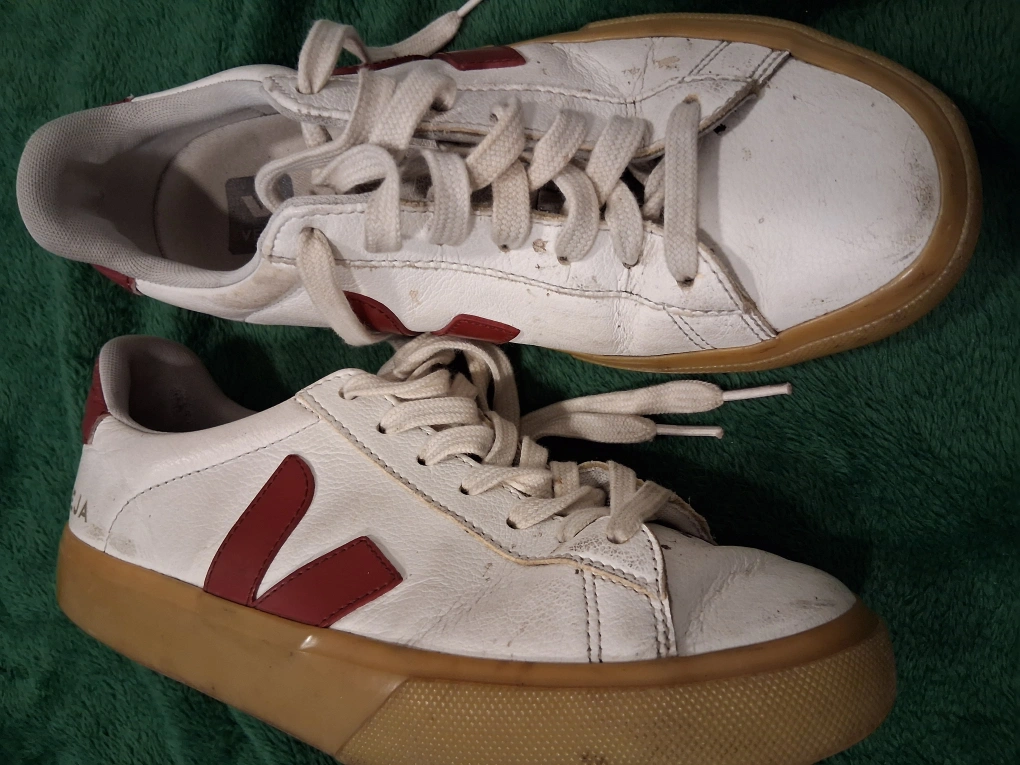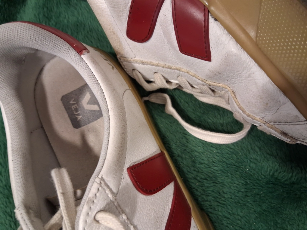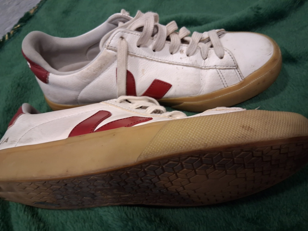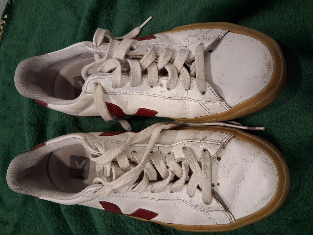 114Selling a pair of Veja sneakers in white with red accents. size 8 women's minor signs of wear