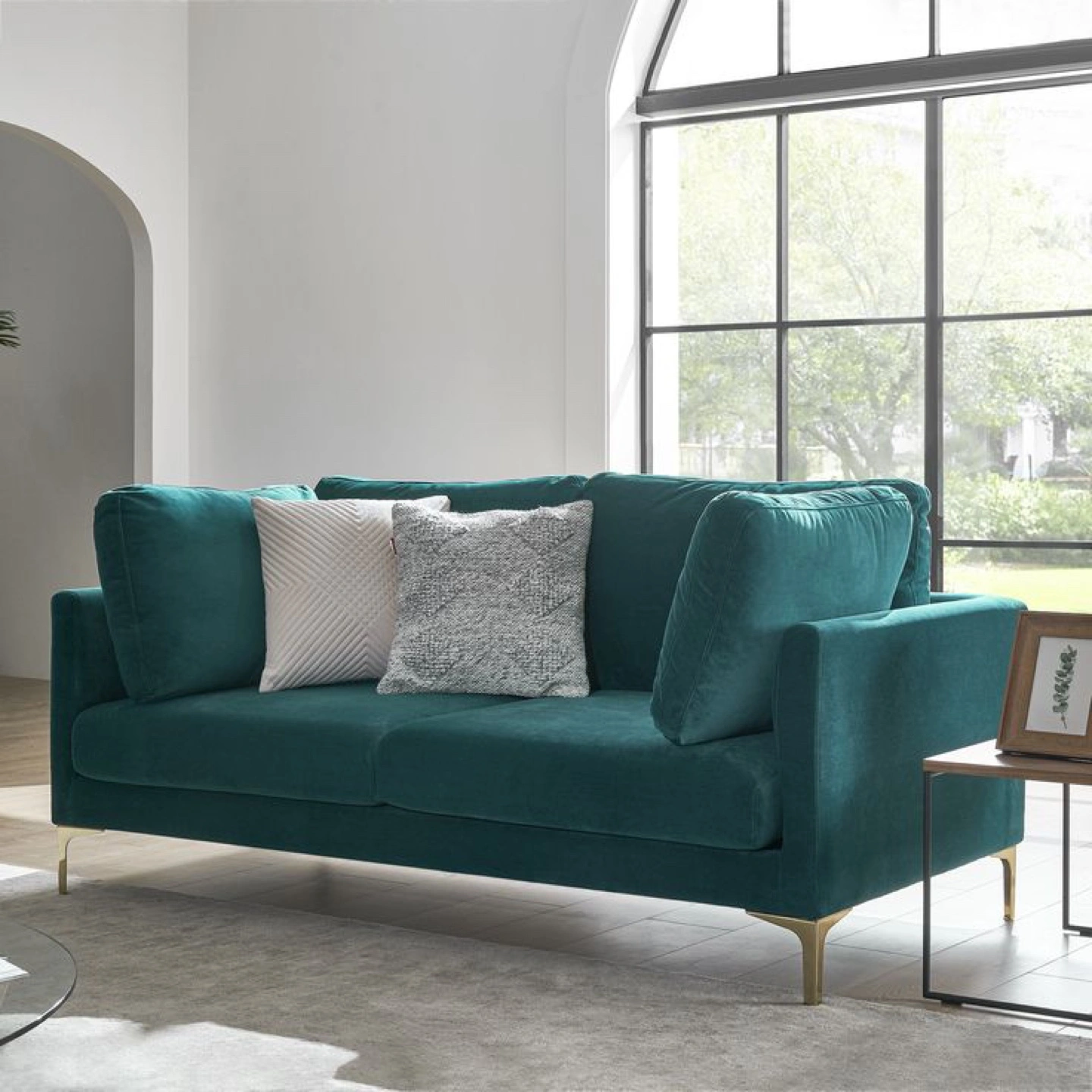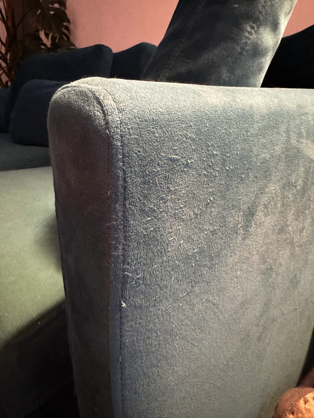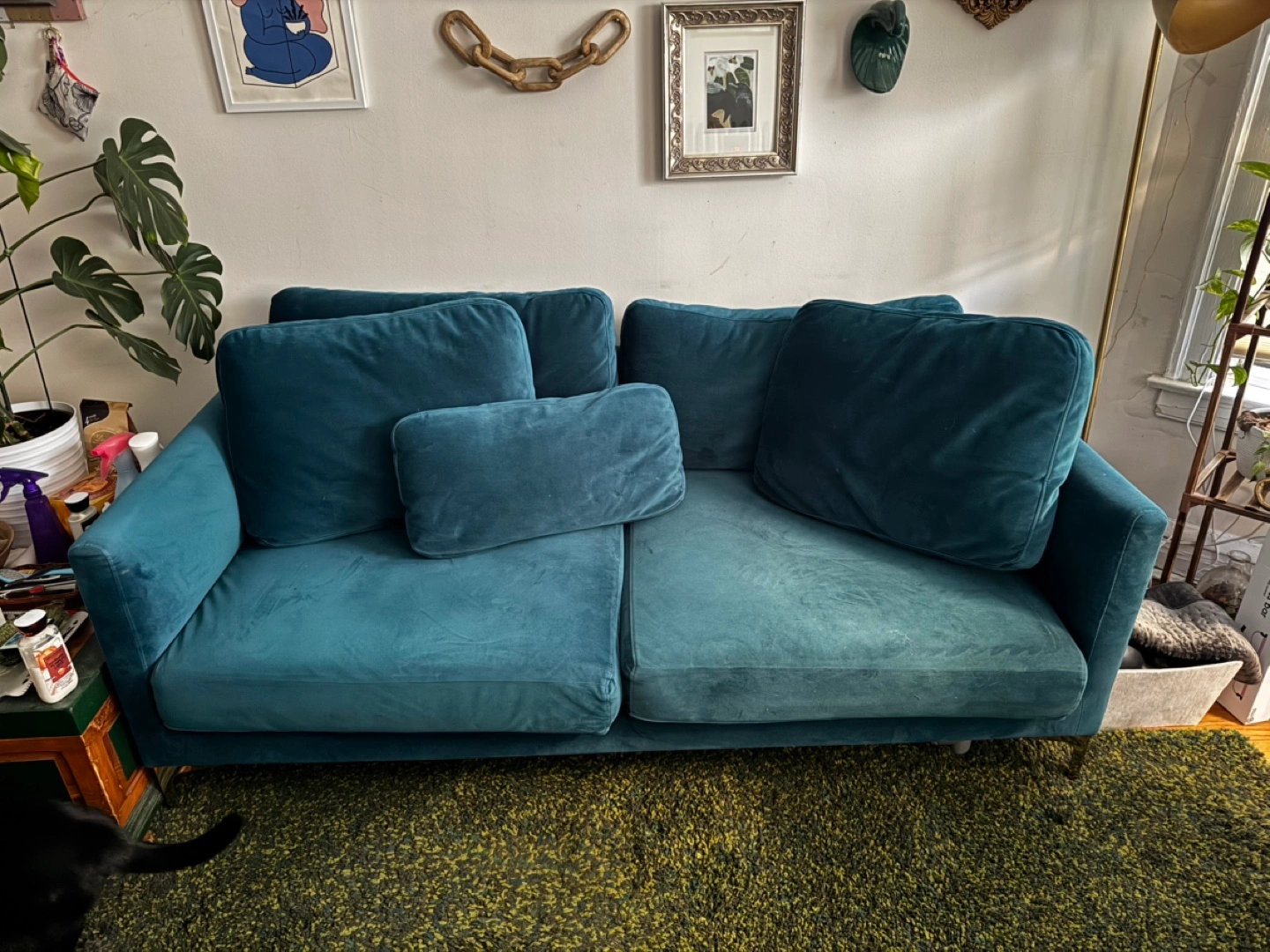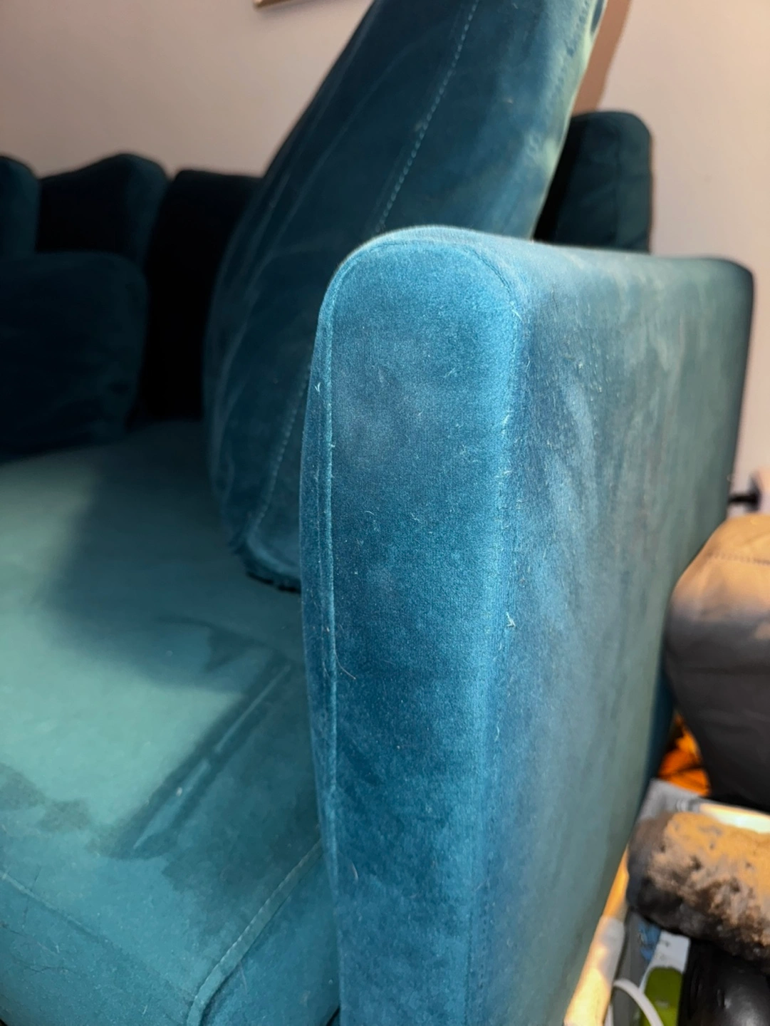 Two seater love seat. Deep seats with velvet teal fabric. Minor cat damage on one arm. Paid $1900 for the set two years ago. Optional ottoman to create a chaise.