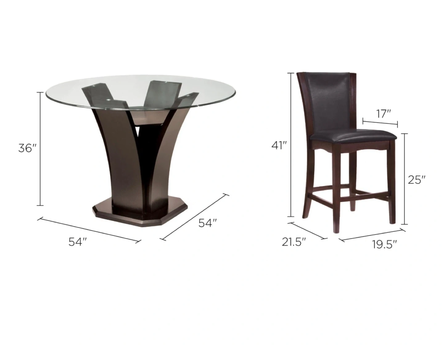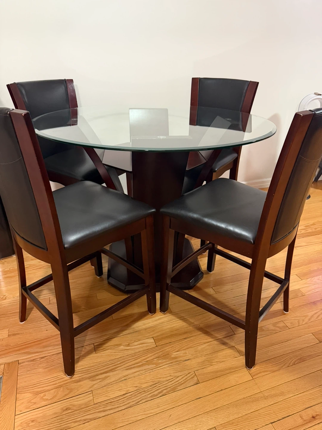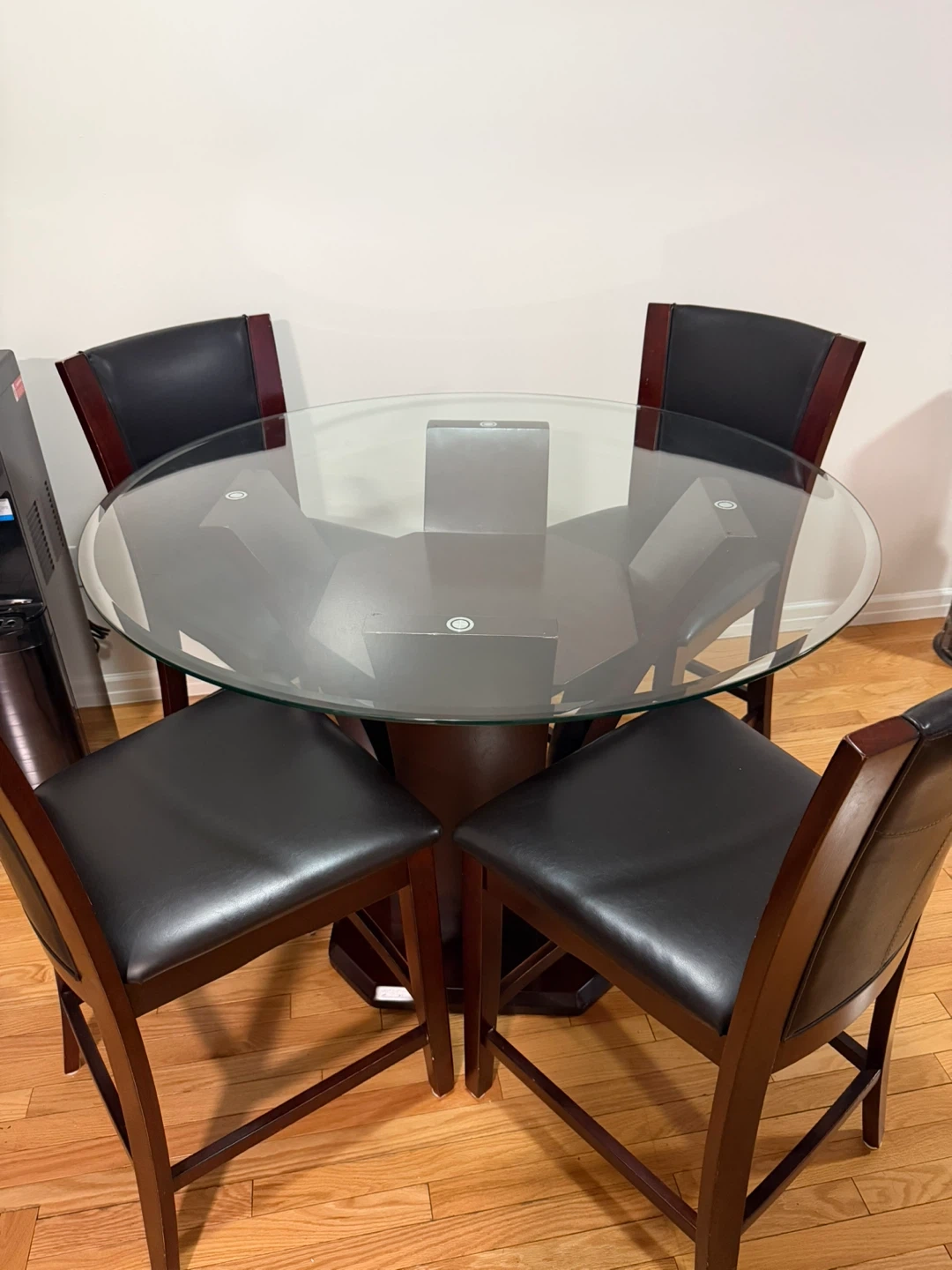 10Selling a Venice 5-piece 54" glass counter-height dining set! This set includes a round glass table and four matching counter-height chairs. The table stands at 36" tall, and each chair is 41" in height. Originally bought for $1,359.96
