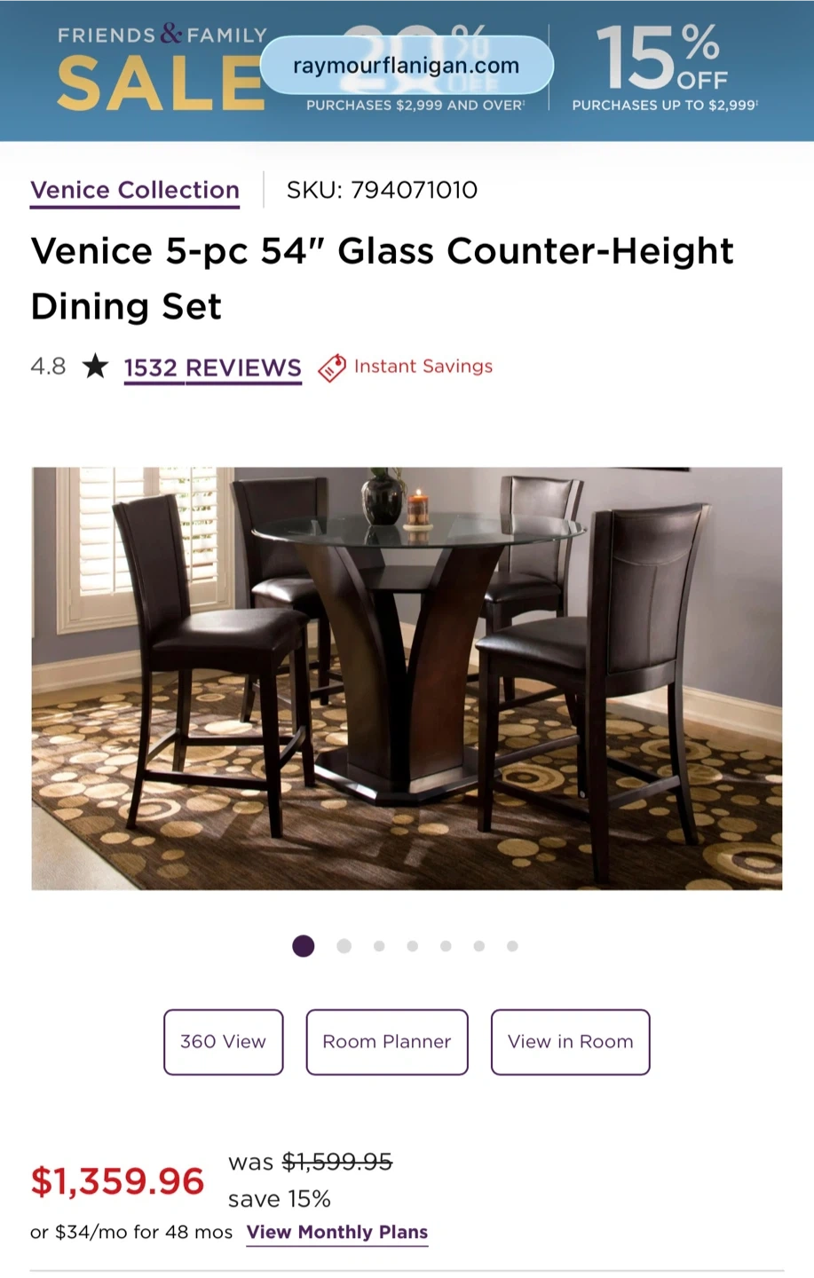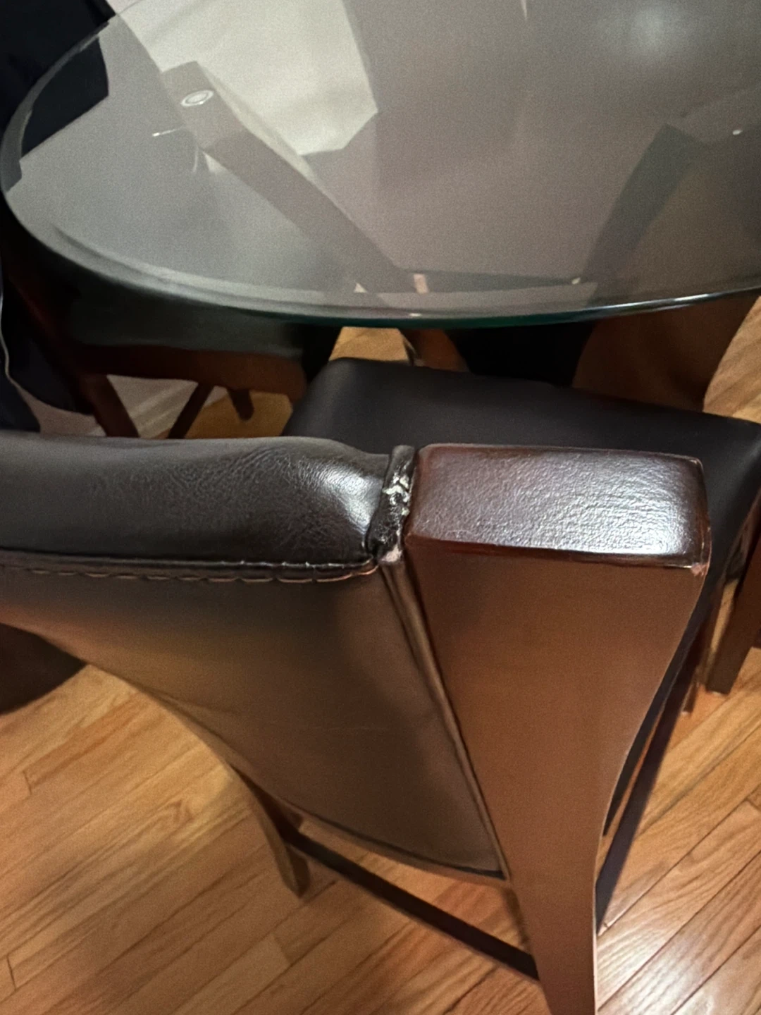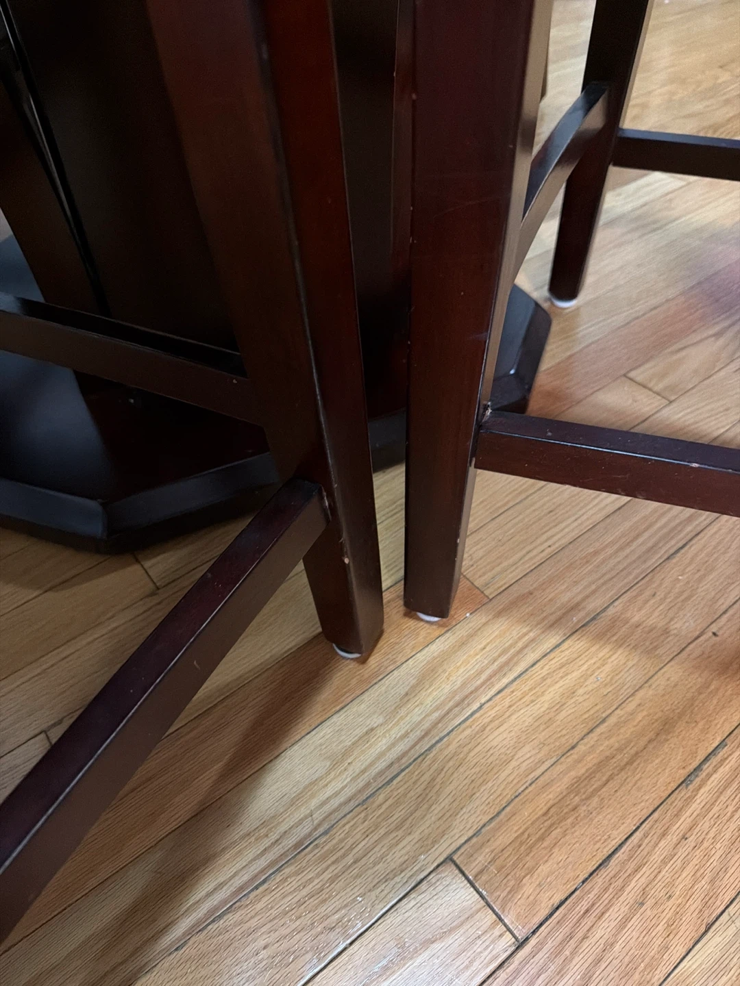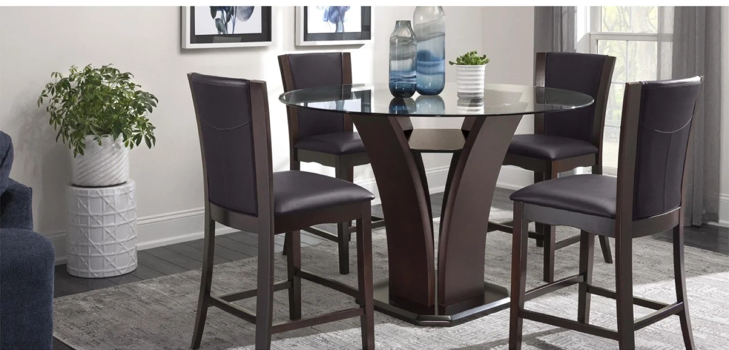 10Selling a Venice 5-piece 54" glass counter-height dining set! This set includes a round glass table and four matching counter-height chairs. The table stands at 36" tall, and each chair is 41" in height. Originally bought for $1,359.96