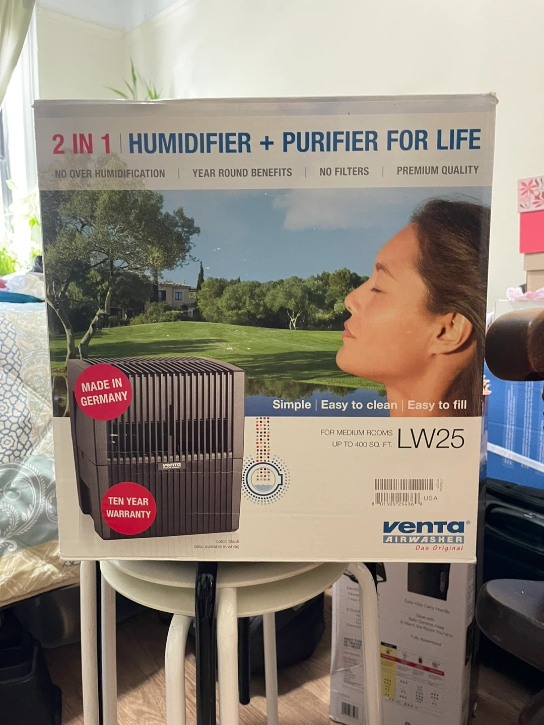 18I'm selling a Venta LW25 Airwasher, which is both a humidifier and air purifier! It's designed for medium rooms up to 400 sq ft. This model is black, but it's also available in white. It requires no filters and is simple to clean and fill. It also has a ten-year warranty!