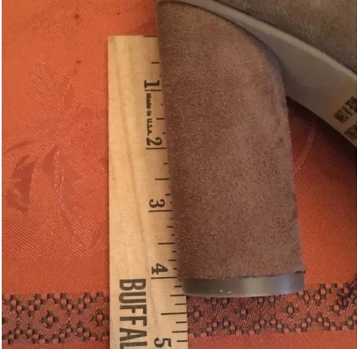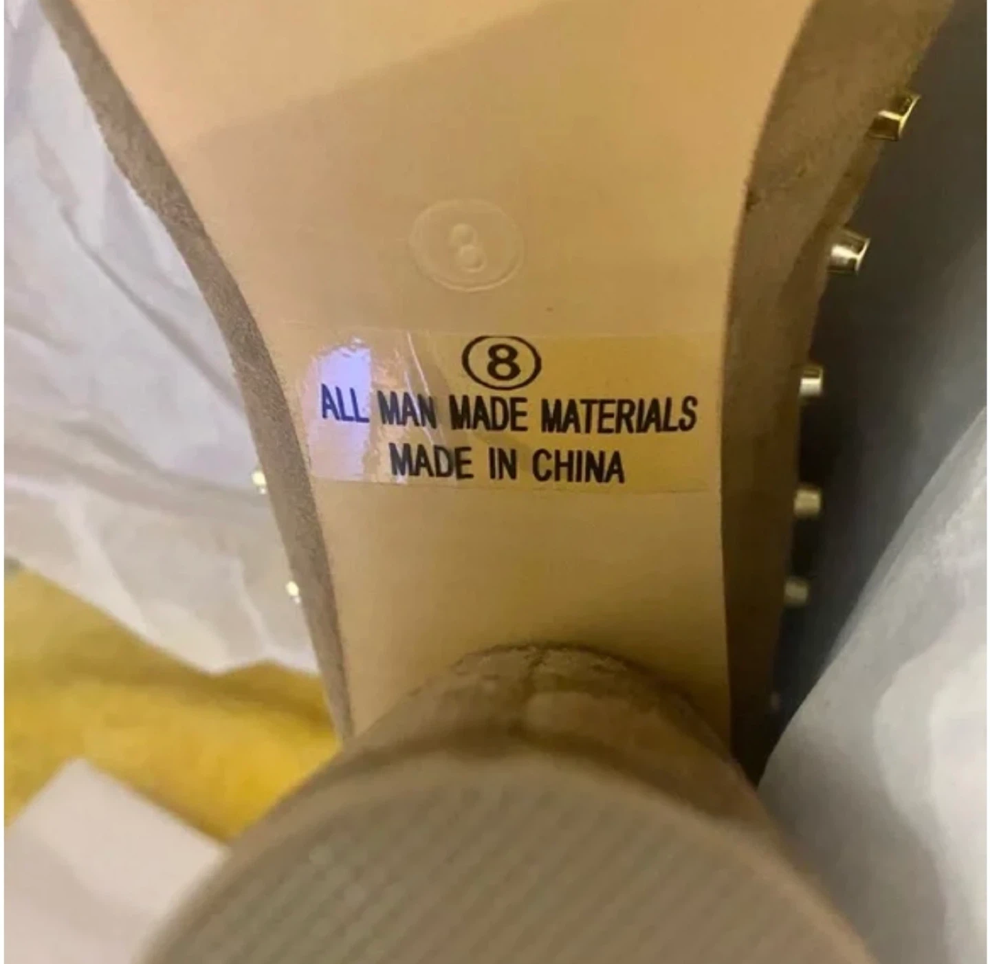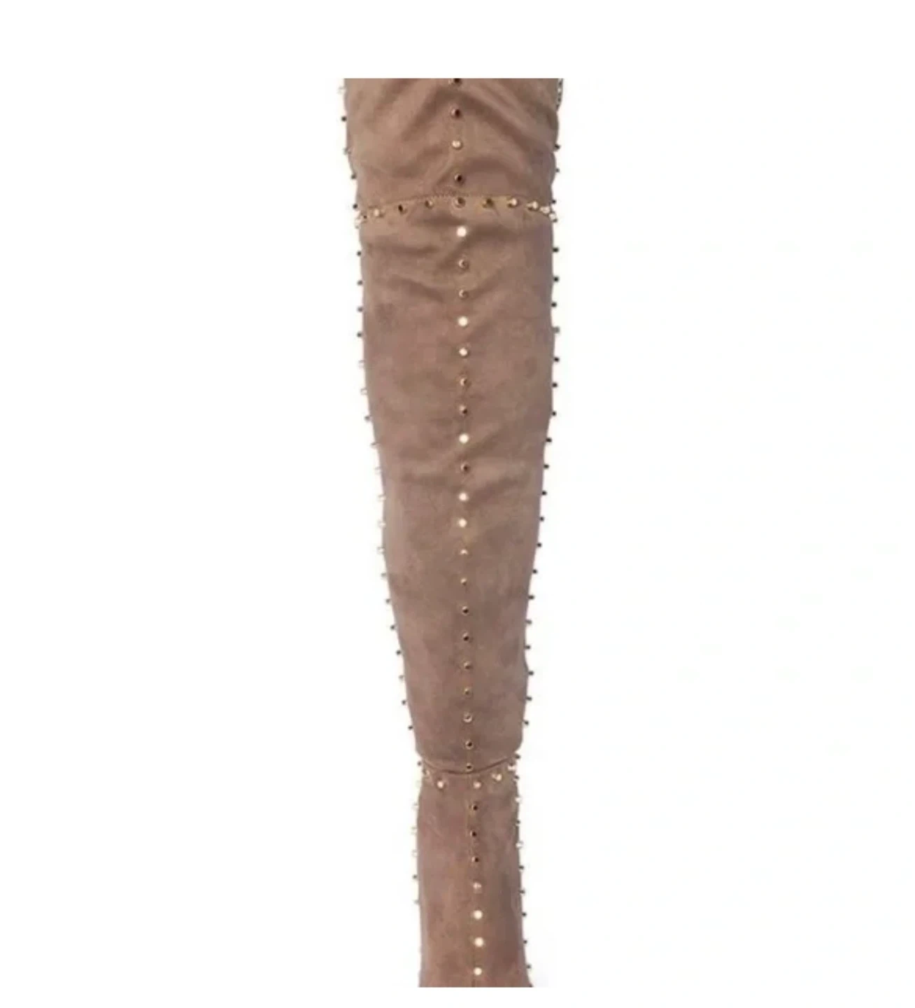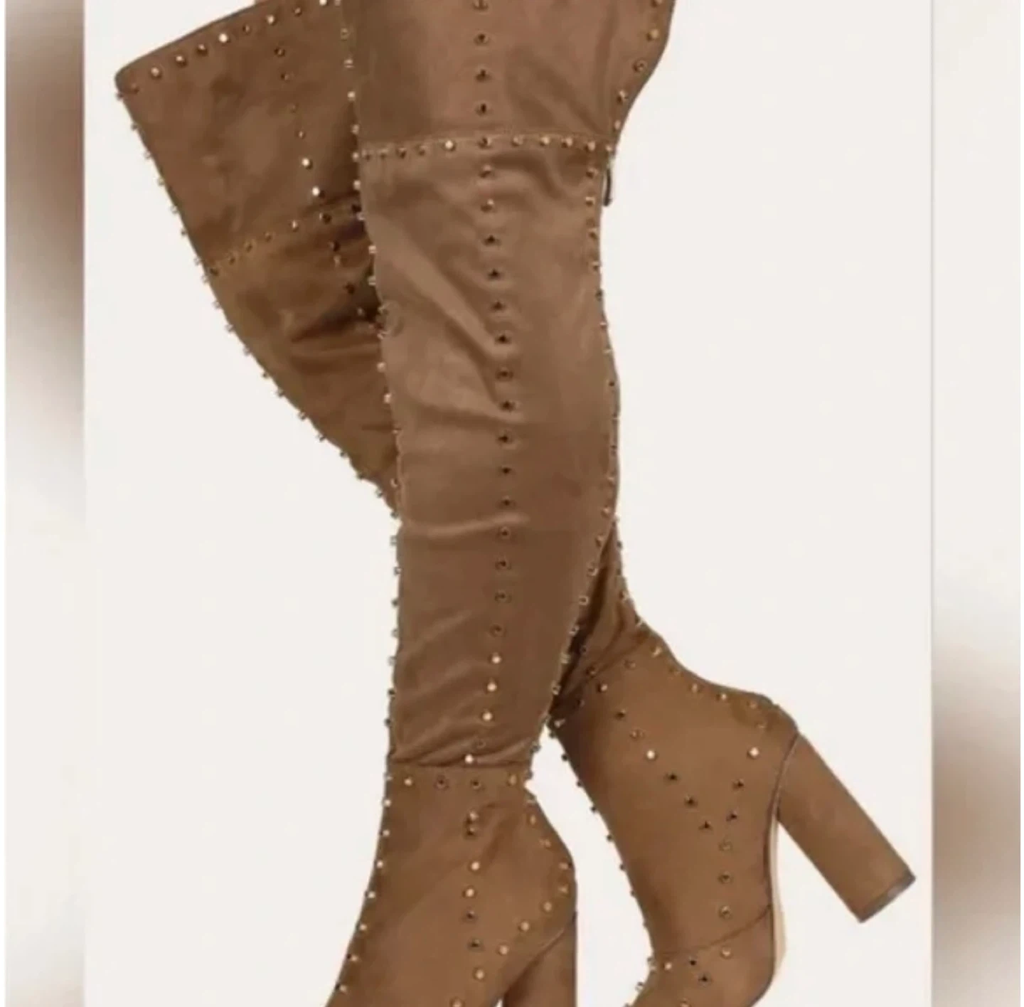 60These are a pair of brown thigh-high heeled boots. They are a size 8 and made of all man-made materials. The heel height is approximately 4 inches.