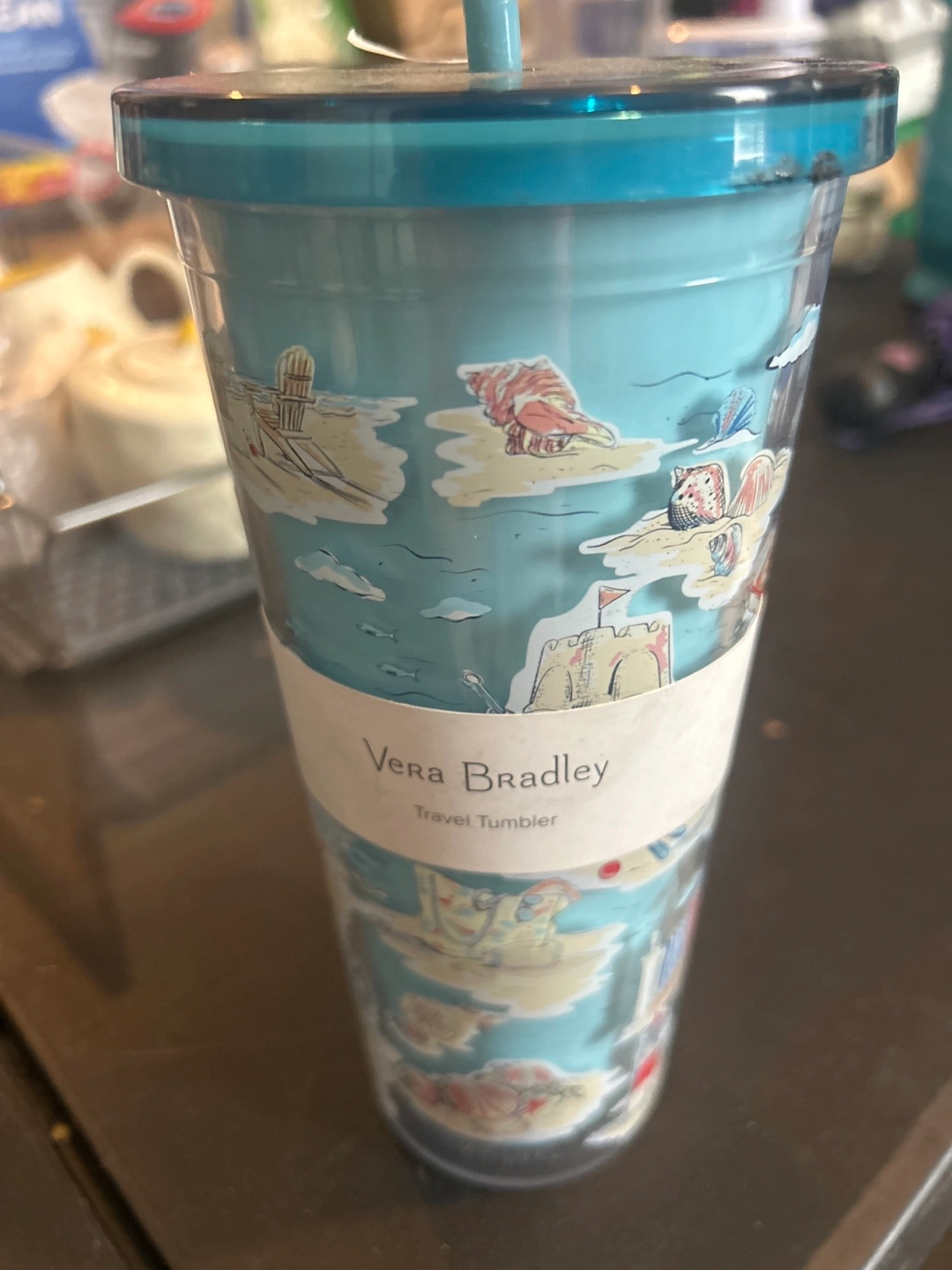 A double wall tumbler with a flexible straw. Features beach scenes printed all over. You could take this tumbler with you to sip your favorite drink while you're relaxing at home. New