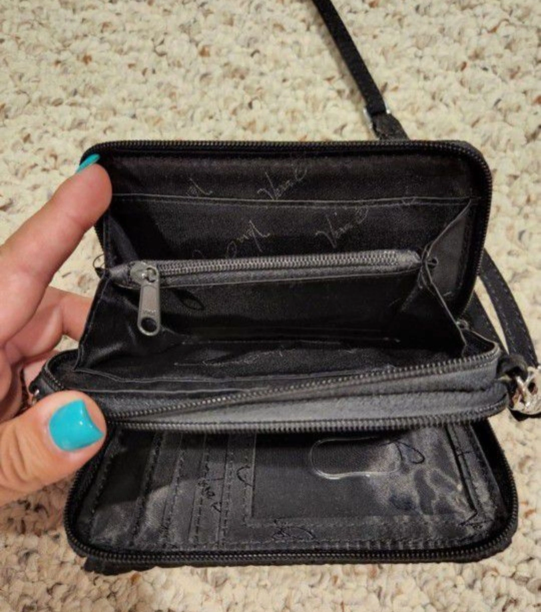 60Selling a Vera Bradley crossbody wallet in black microfiber! Features: - Side snap pocket - 2 interior zippered compartments - 1 zip coin pocket - 6 slip pockets, 6 card slots and an ID window Measures approximately 5-1/2" wide, 3-1/2" high, and 2" deep with an adjustable and removable crossbody and wristlet strap.