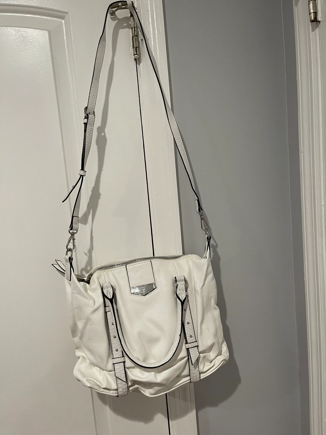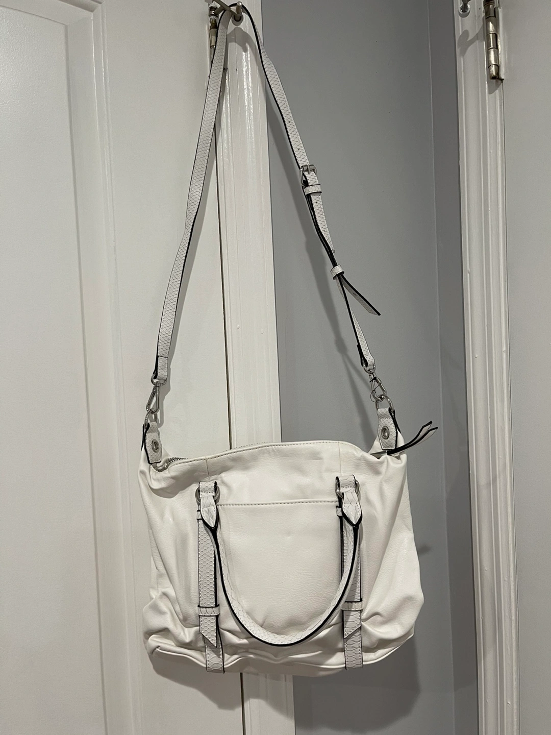 34White leather-like satchel handbag. Features a long crossbody strap and top handles. Zipper closure. Small front pocket.