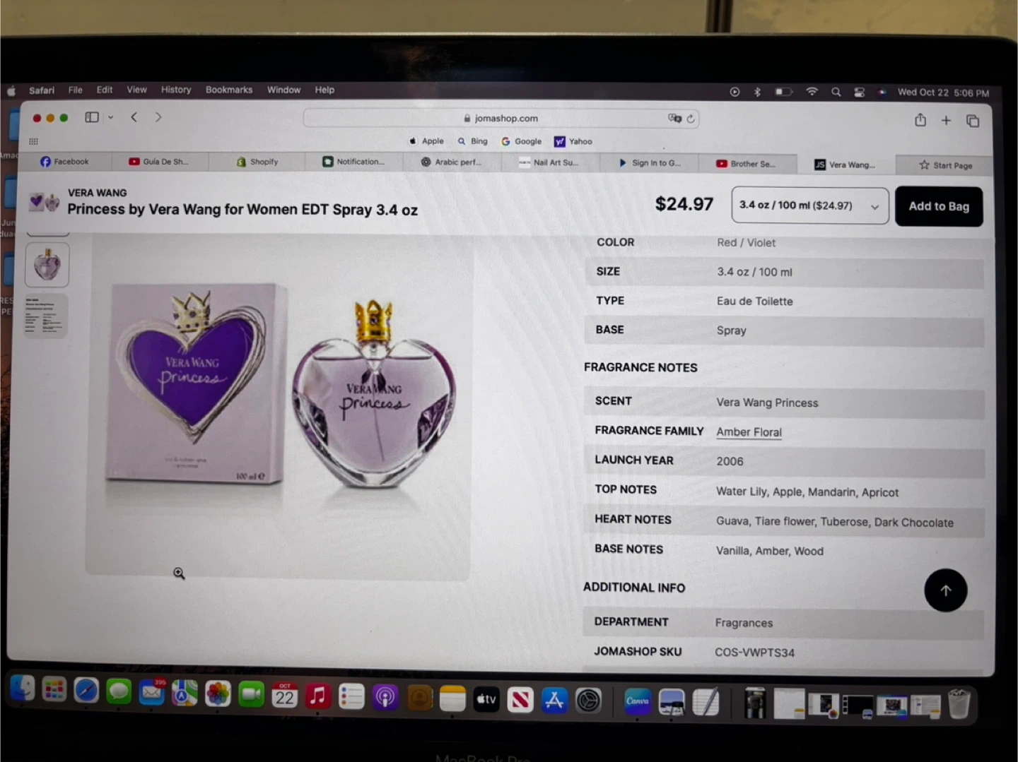 10Selling a Vera Wang Princess Eau de Toilette spray for women. It's a 3.4 oz (100 ml) bottle. The scent is described as Vera Wang Princess with an amber floral fragrance family. You'll notice top notes of water lily, apple, and mandarin, with heart notes of guava, tiare flower, tuberose, and dark chocolate, and base notes of vanilla, amber, and oud