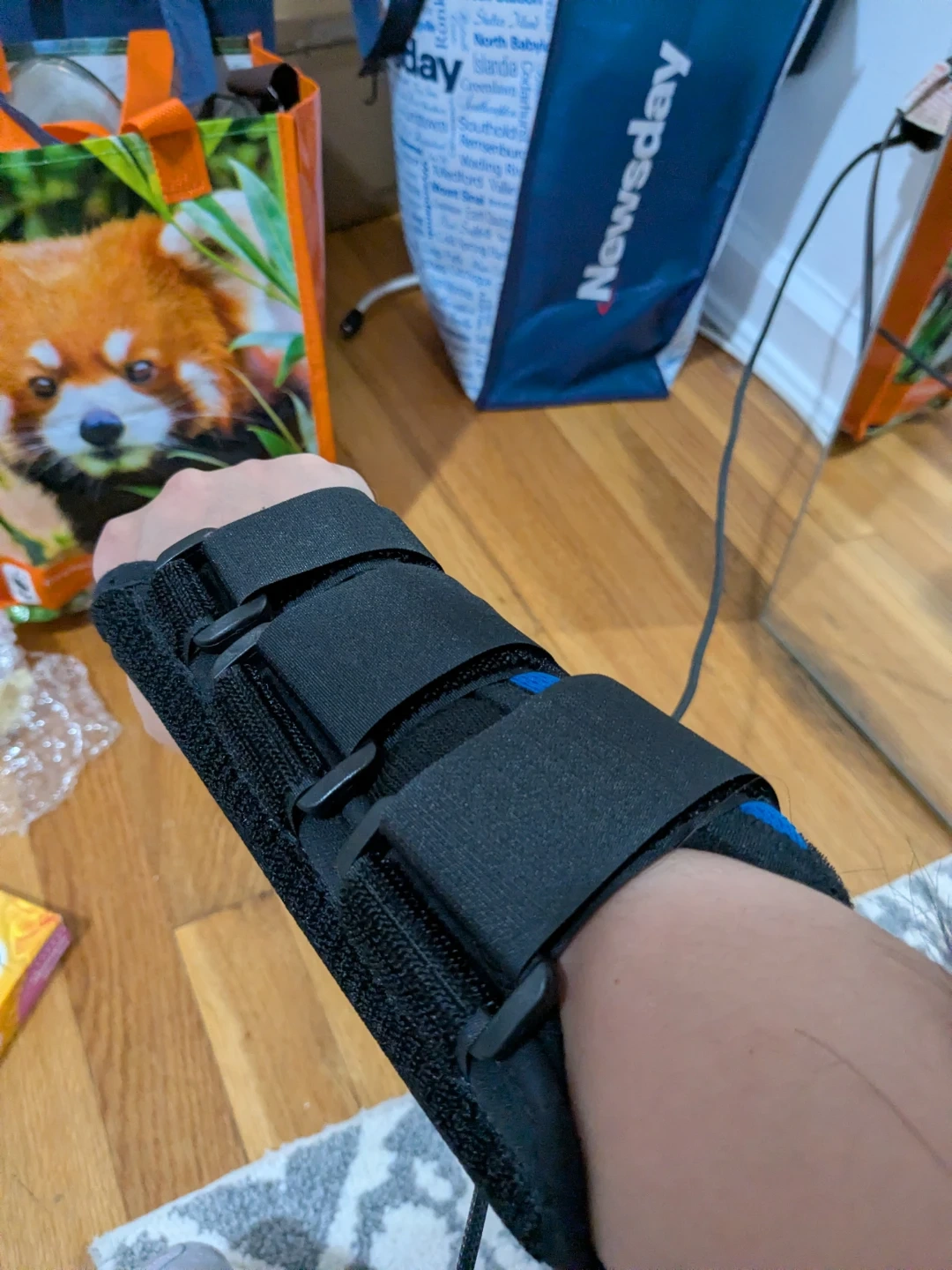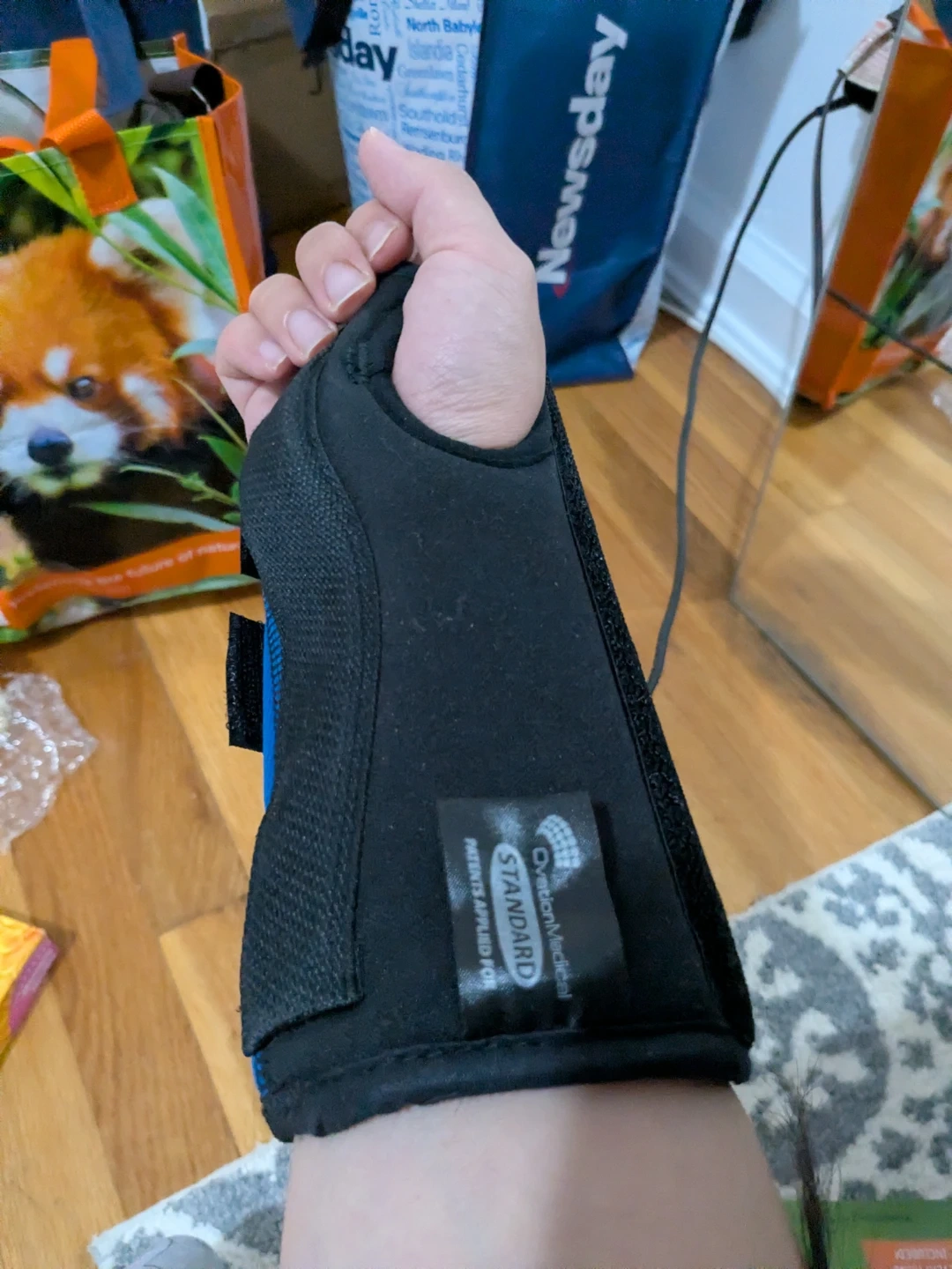 151I'm selling a Versa Fit wrist stabilizer. It's black with blue accents and has adjustable straps for a comfortable fit. It provides support and stability for your wrist, perfect for recovery or injury prevention Fits in the right hand. Only used once