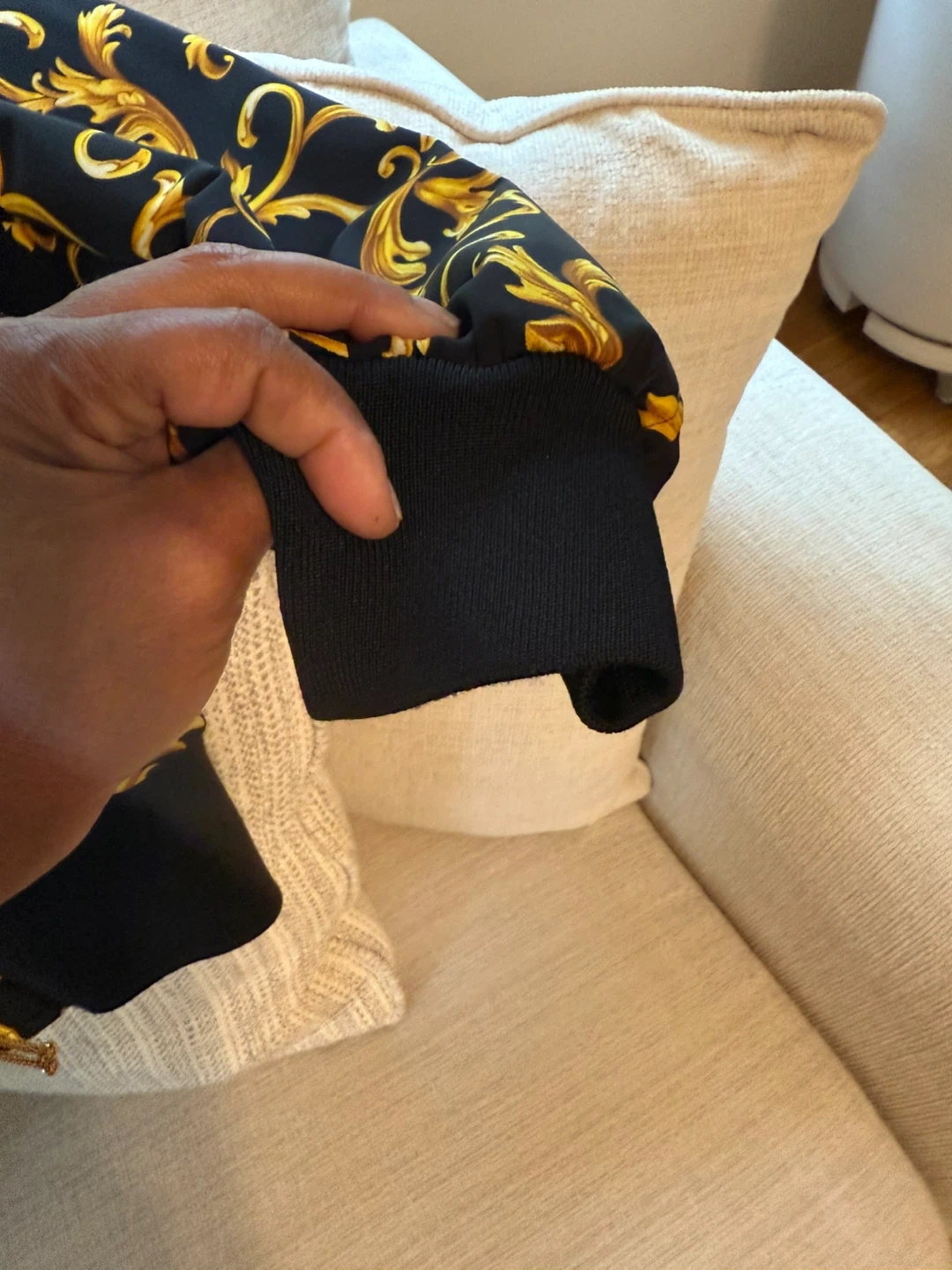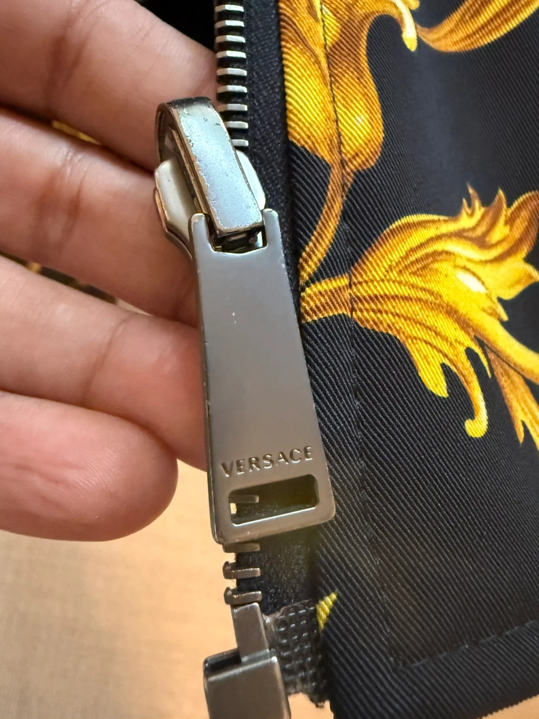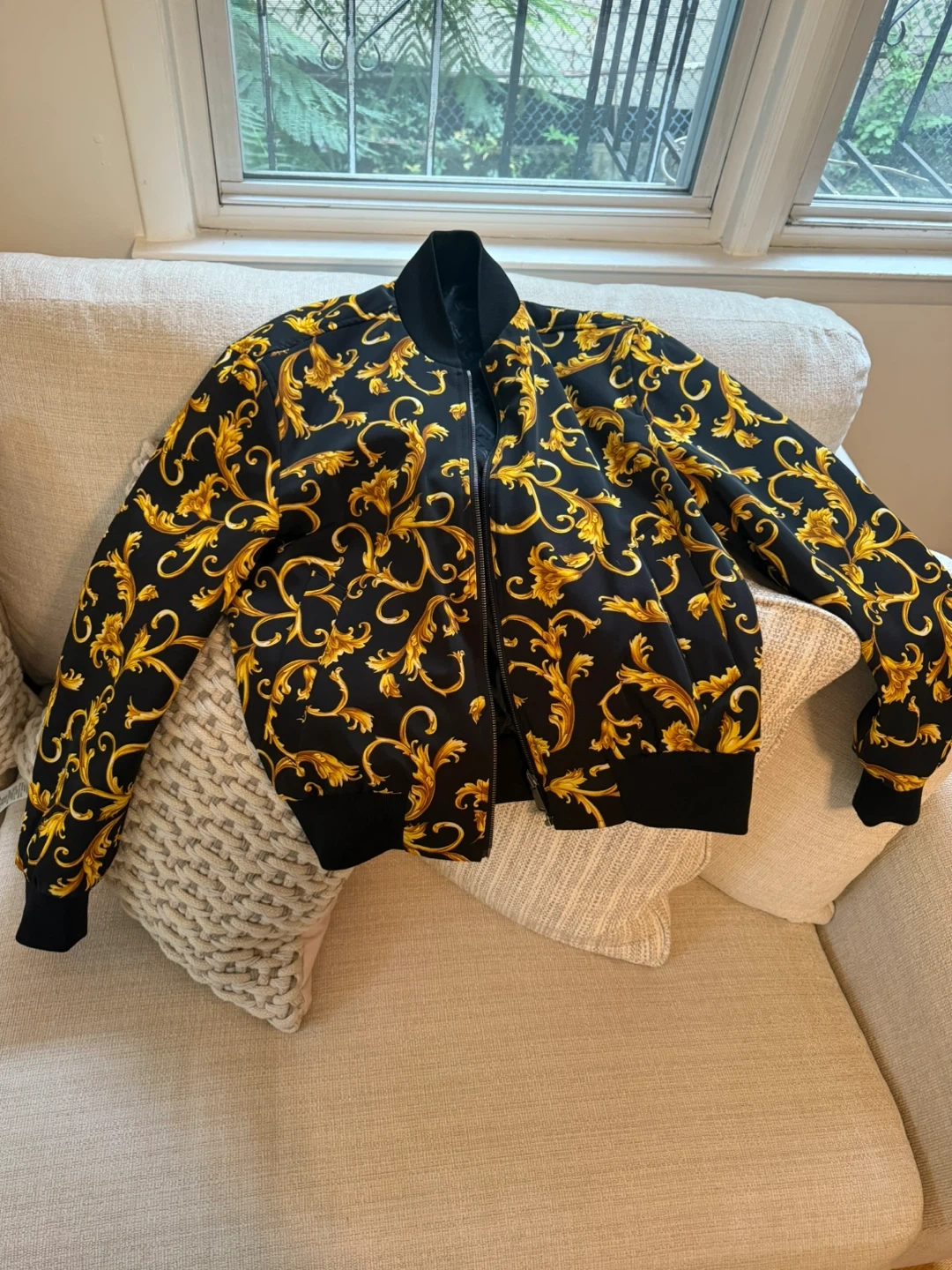 Selling a stylish Versace bomber jacket in black, size 46. It features a unique pattern and a gold-colored lining with a floral design. The zipper pull also has the Versace logo. Perfect for adding a touch of luxury to your wardrobe!