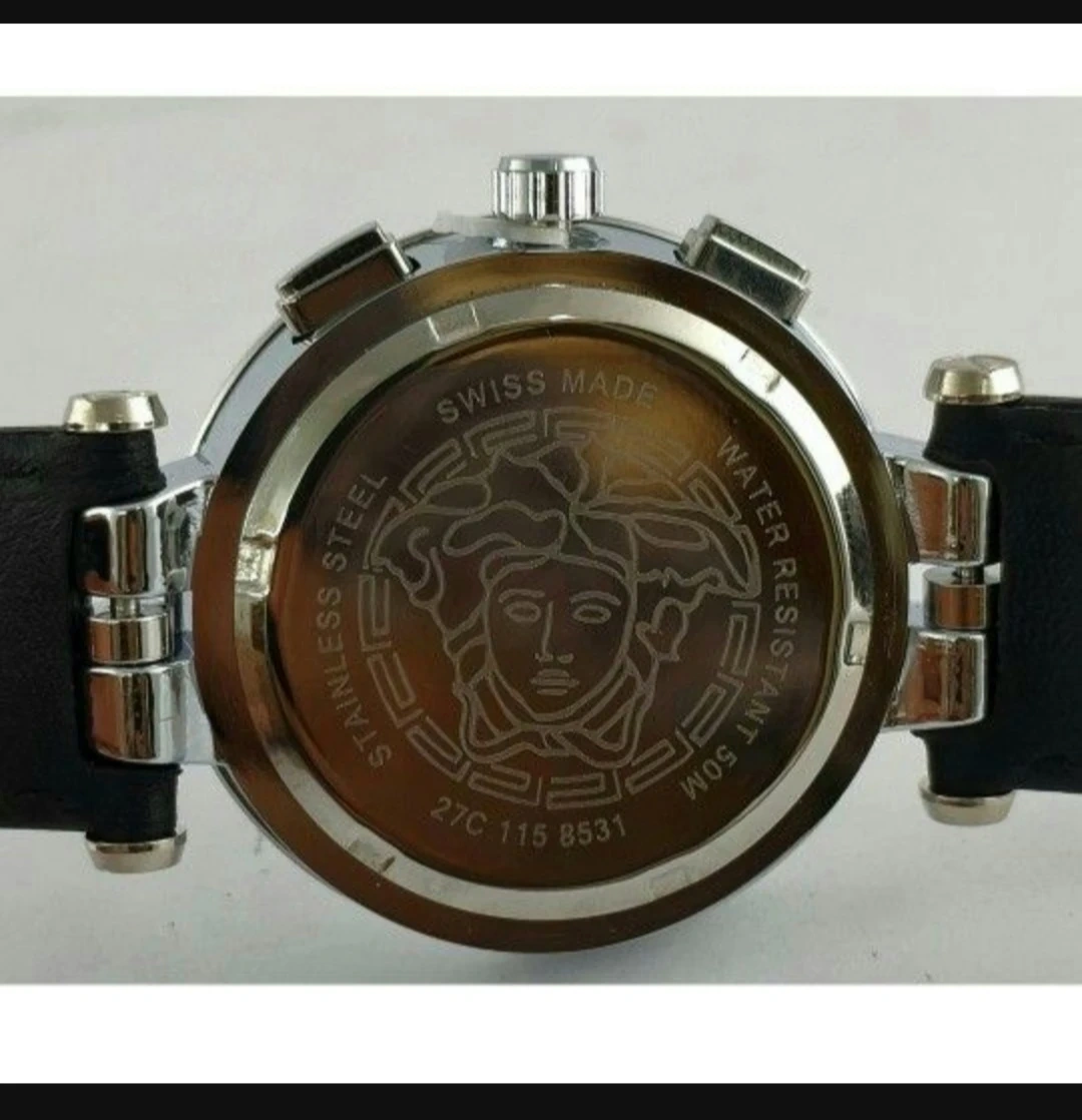 67Selling a stylish Versace men's watch with a striking blue dial! The watch features the iconic Versace logo and a sleek black leather strap. Swiss made and water resistant up to 50m. A great addition to any wardrobe! ******************************** Excellent VERSACE White Date Indictor Man's Quartz Wrist Watch Style Casual Color: Black, White Clasp: Buckle Gender: Men's Crystal Mineral Water Resistance: 5 Atm: Suitable for Swimming, White Water Rafting, and Fishing Movement: Quartz Dial Type: Analogue Functions: Chronograph, Date Country of Origin: Switzerland