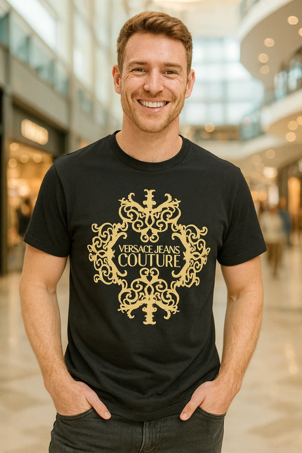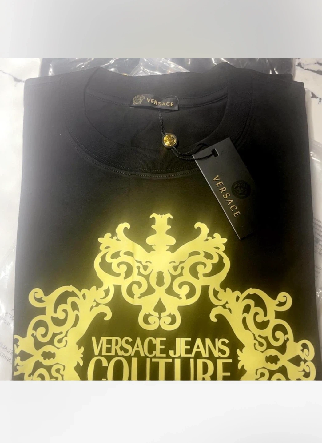 82Selling a Versace Jeans Couture t-shirt in black. It features a gold-colored design on the front. The size is L. It's still in its original packaging! Www.royalmantle.shop