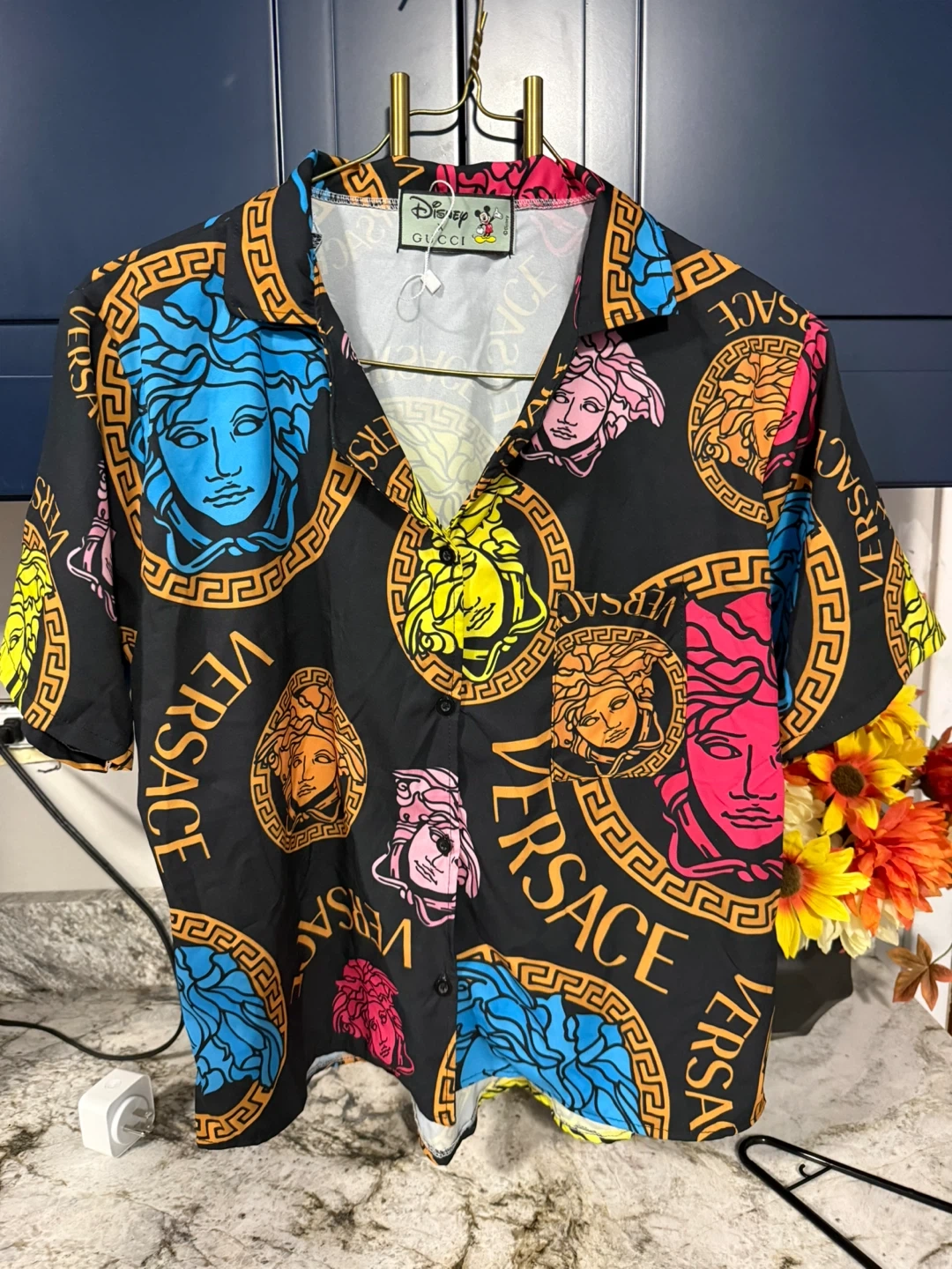 Like new Selling a Versace print button-down shirt. It features a colorful Versace Medusa head design all over a black background. Great for adding a pop of color to your wardrobe!