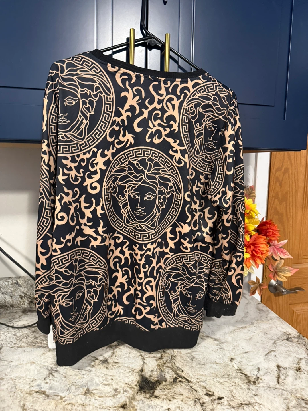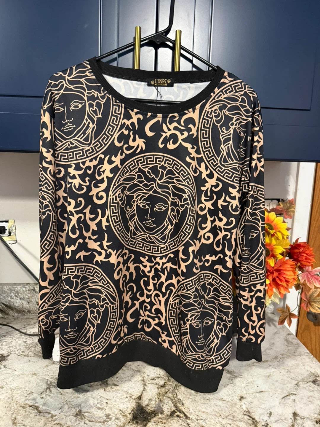 Not Real Brand Here's a cool Versace style long sleeve shirt! It features a black background with a gold-like print, giving it a unique and stylish look. The material feels soft and comfortable, perfect for casual wear. It's in great condition and ready for a new home!