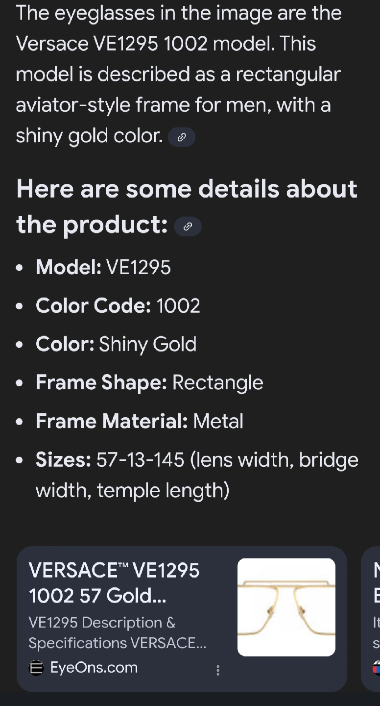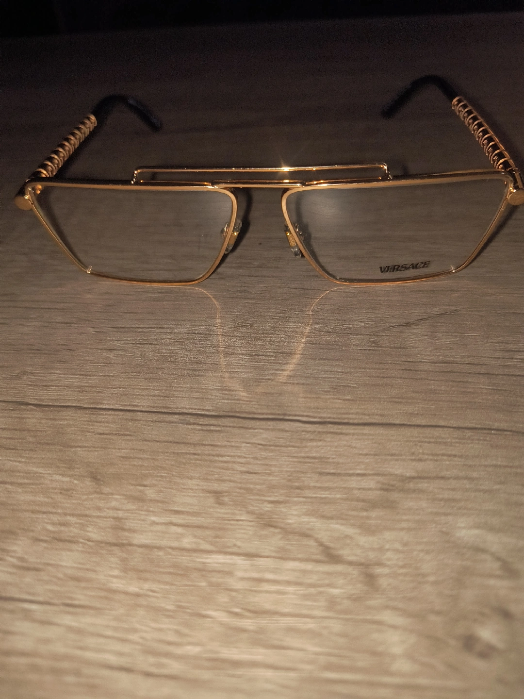 59Selling a pair of Versace VE1295 1002 eyeglasses. These are a rectangular aviator-style frame for men, with a shiny gold color. The frame is made of metal. The sizes are 57-13-145 (lens width, bridge width, temple length)