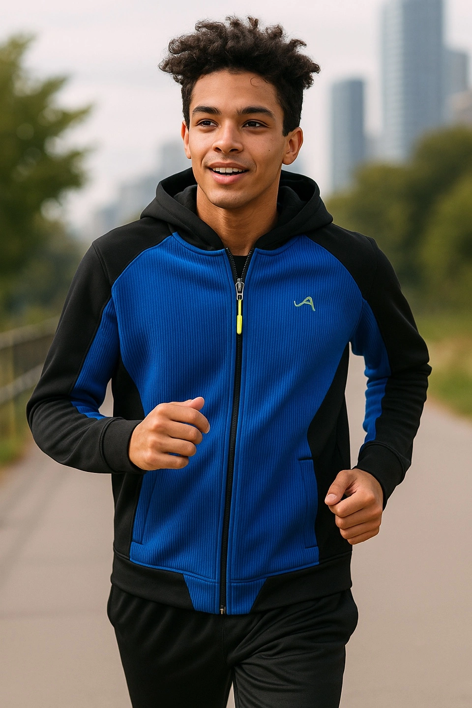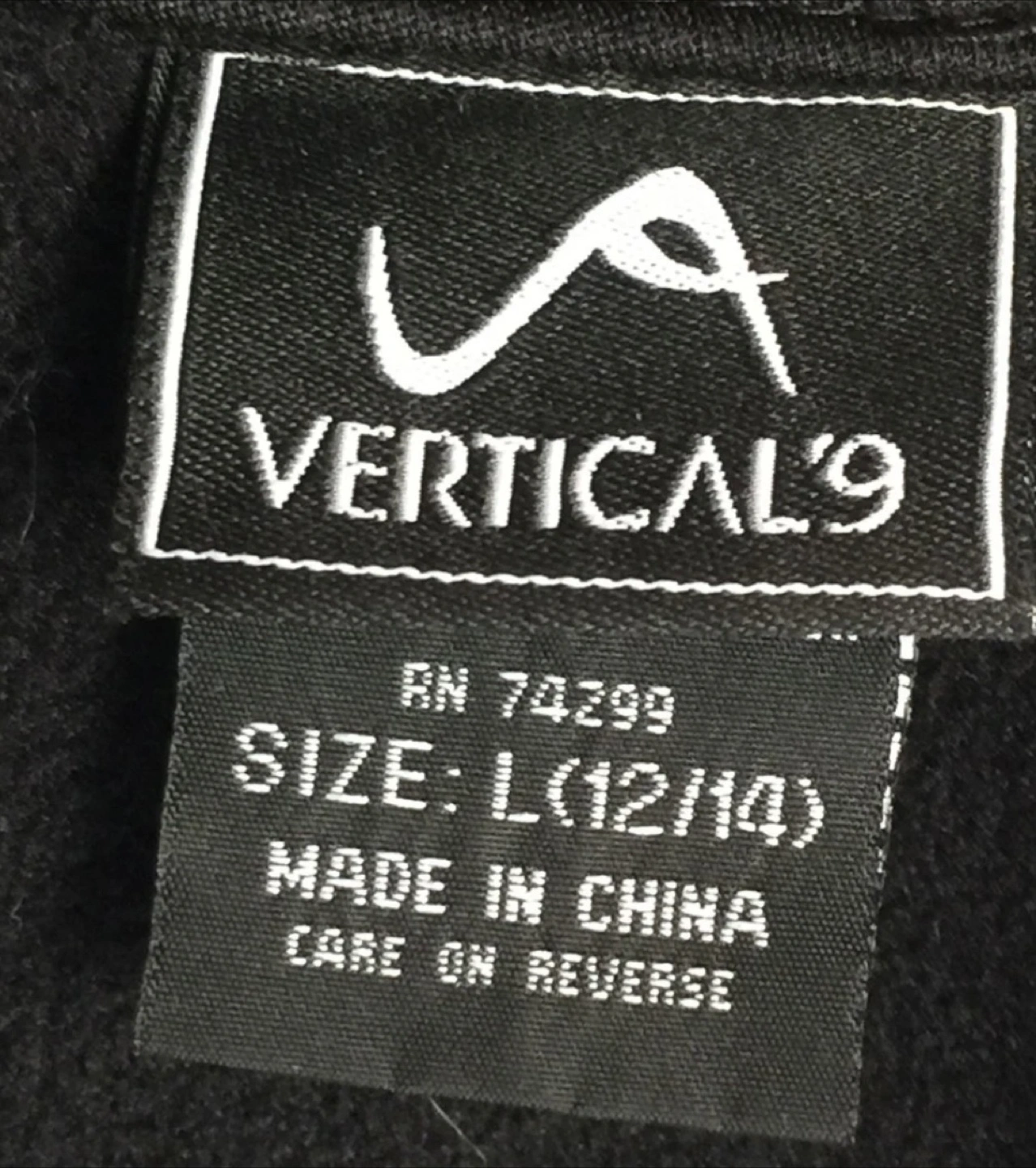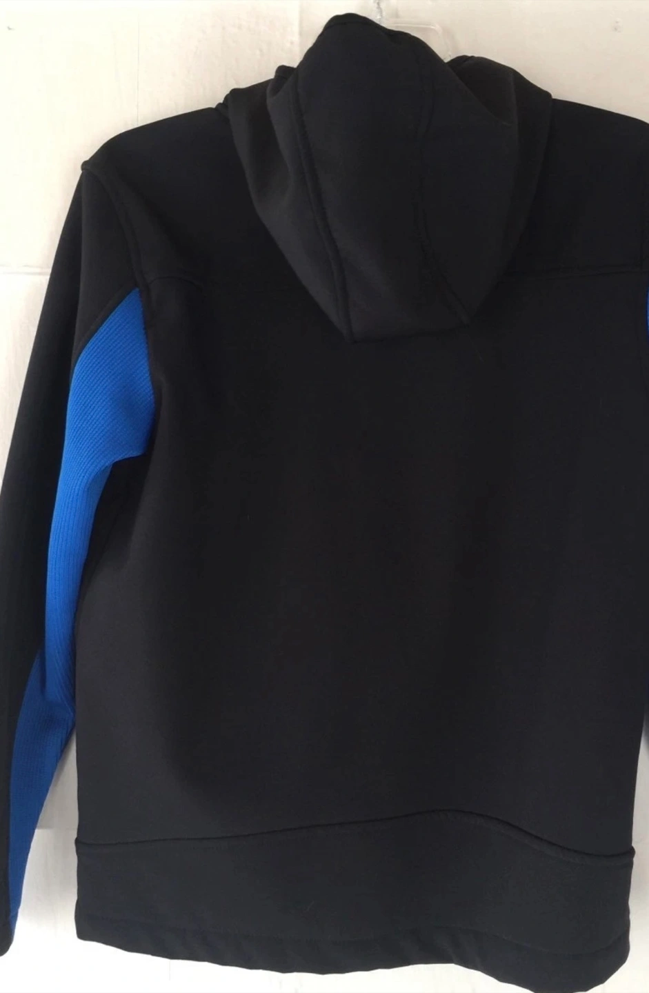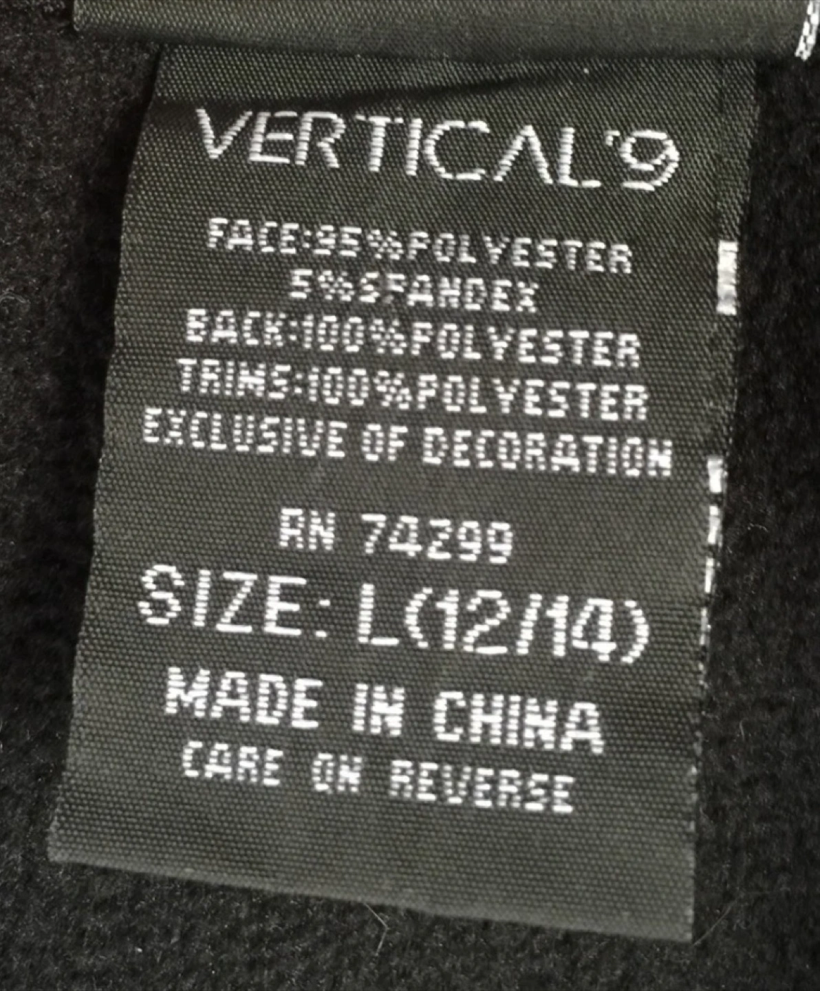 47Selling a Vertical'9 hoodie in blue and black. It's a size L (12/14) and made of 95% polyester, 5% spandex (face), 100% polyester (back and trims). Great for running or just hanging out