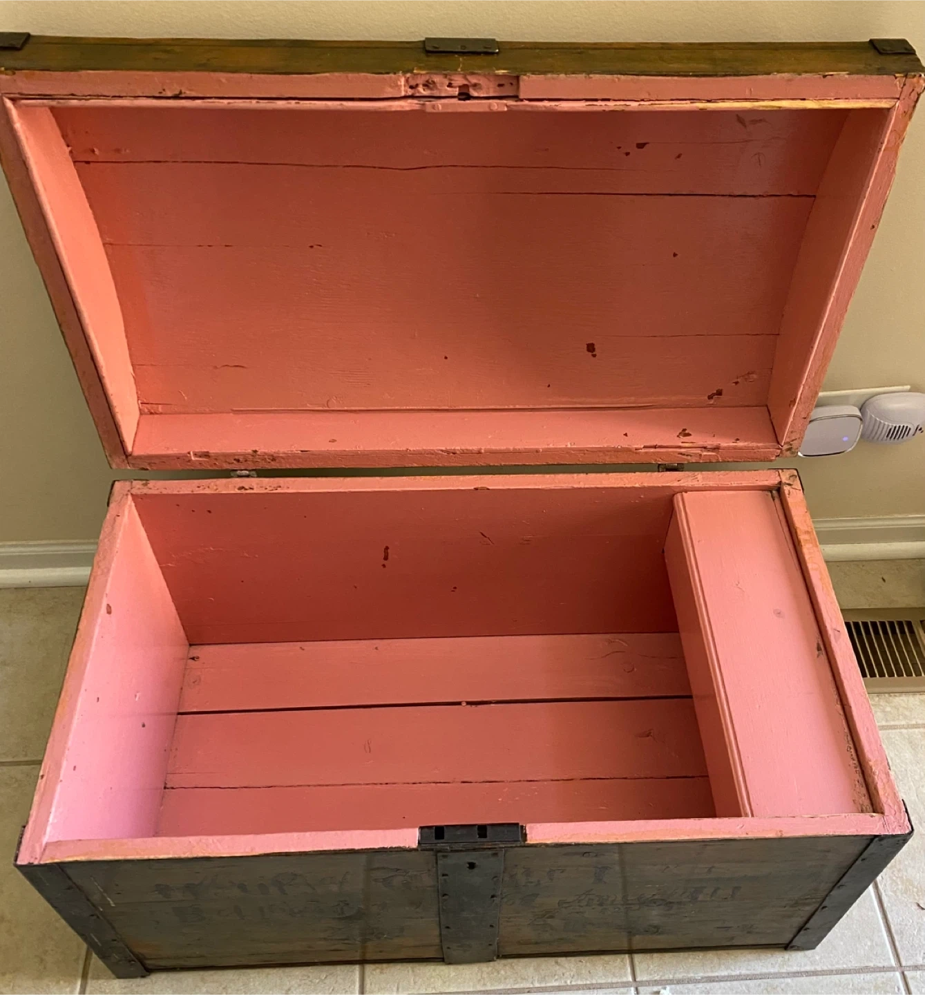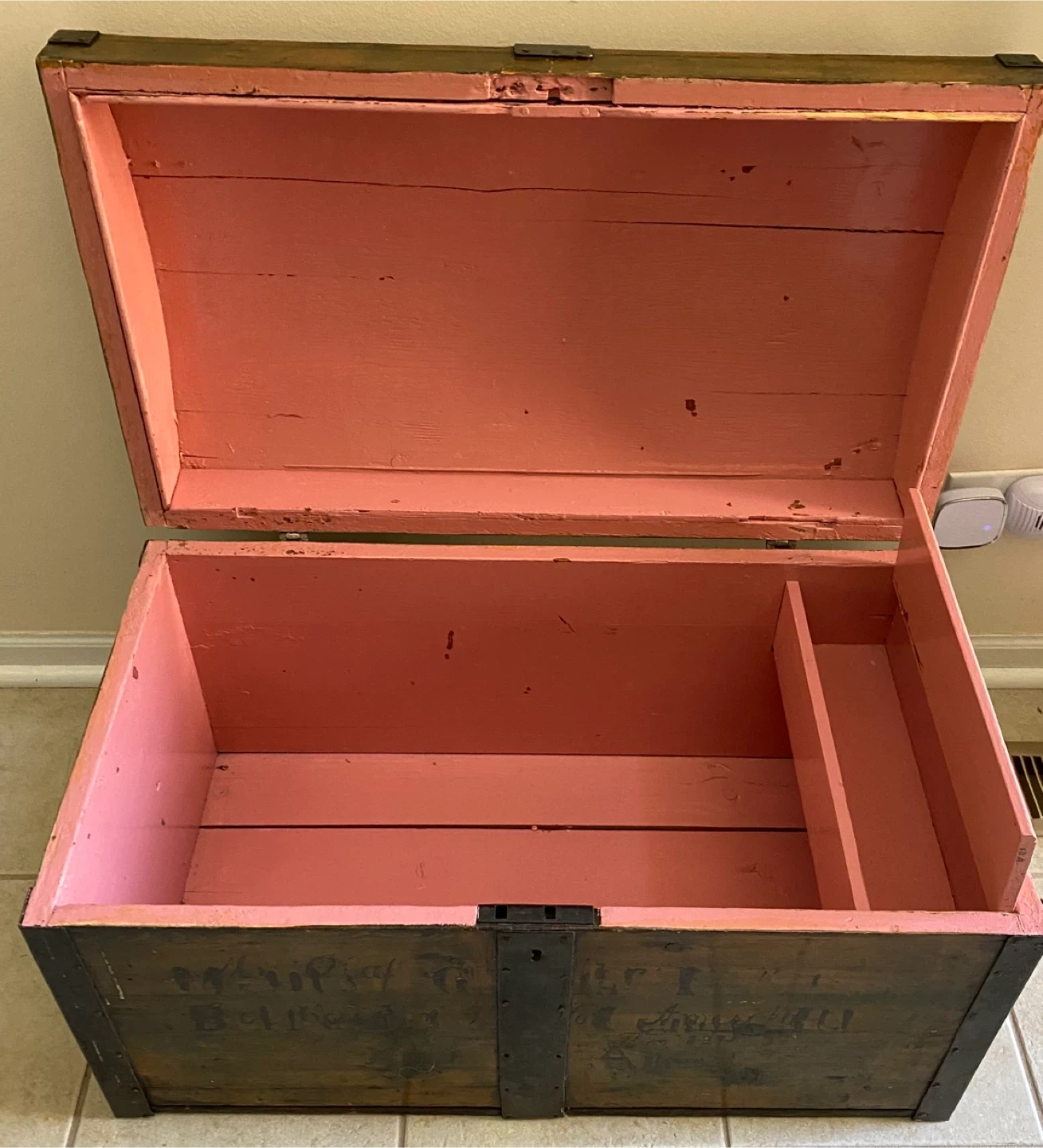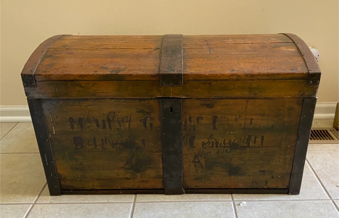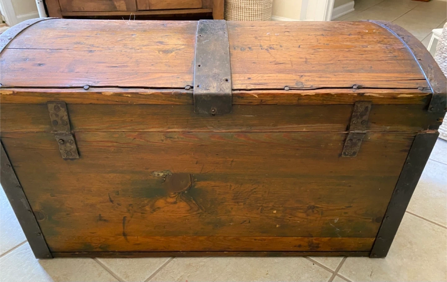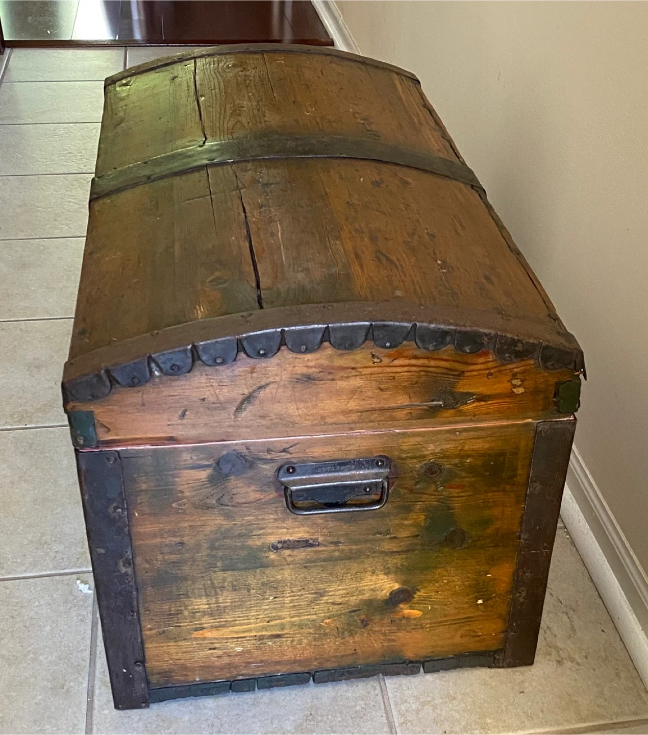 10Selling a very old immigrant wood and metal trunk. It has a curved top and metal banding. It would be perfect for storage or as a decorative piece . In very good condition for its age.