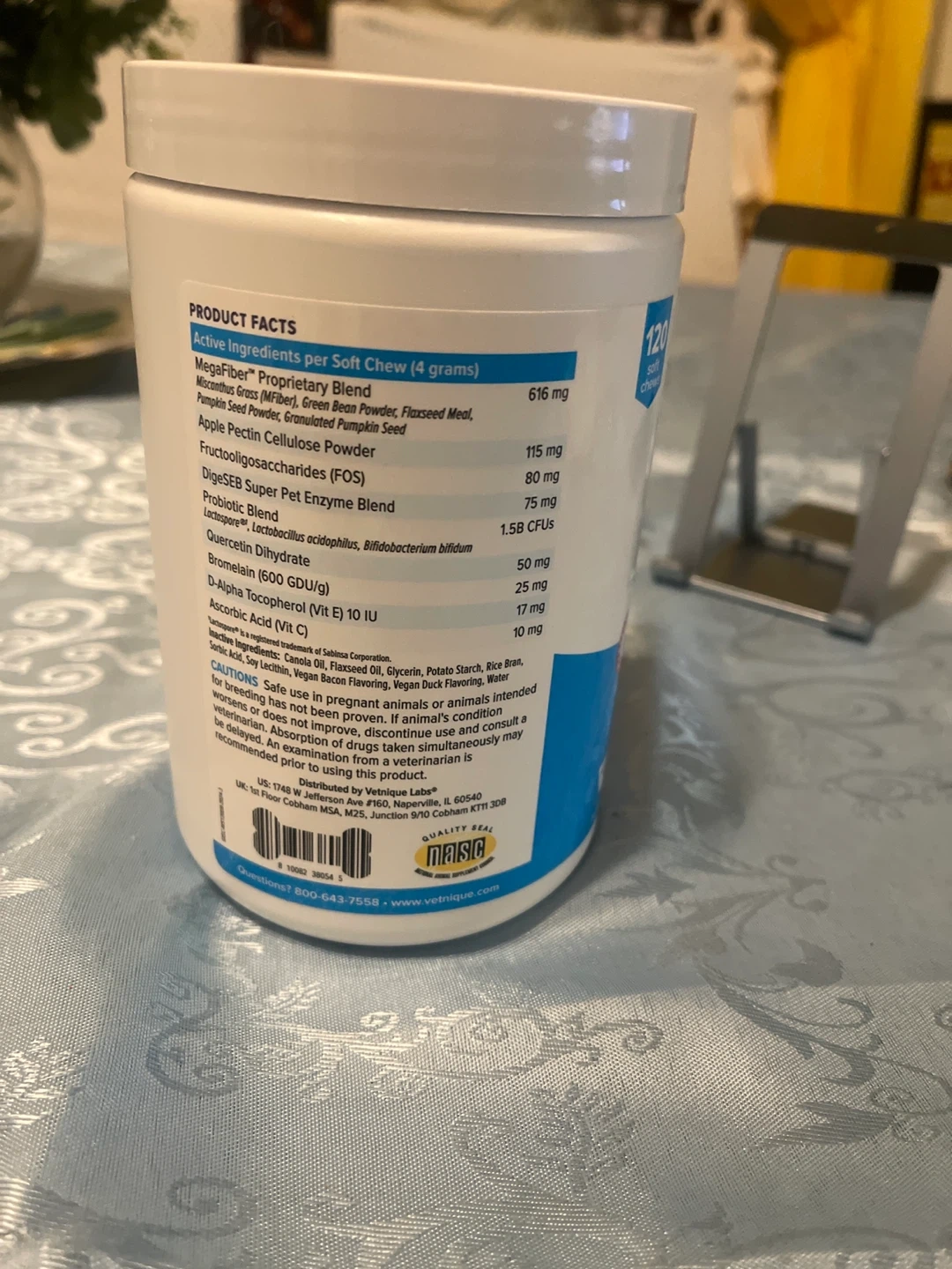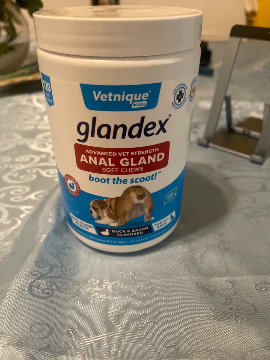 I'm selling Vetnique Labs Glandex Advanced Vet Strength Anal Gland Soft Chews for dogs. These chews are duck and bacon flavored and come in a 120 count container. They contain ingredients like pumpkin seed, apple pectin cellulose powder, and probiotics. Perfect for supporting your dog's anal gland health!