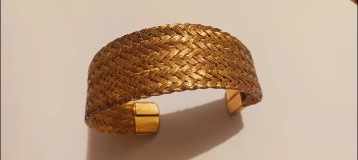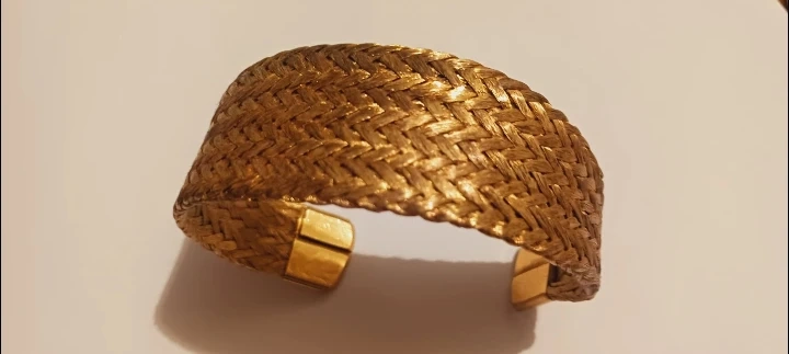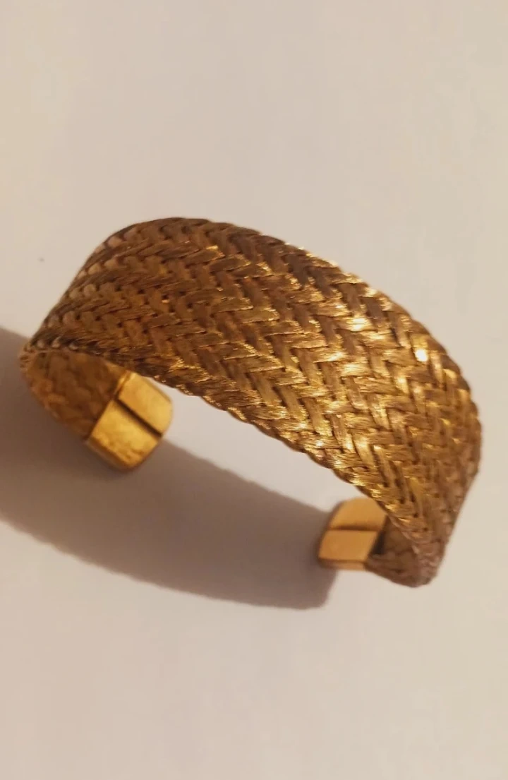 A stylish woven cuff bracelet with gold-tone end caps. It's a unique accessory for any outfit. The woven texture adds an interesting detail.