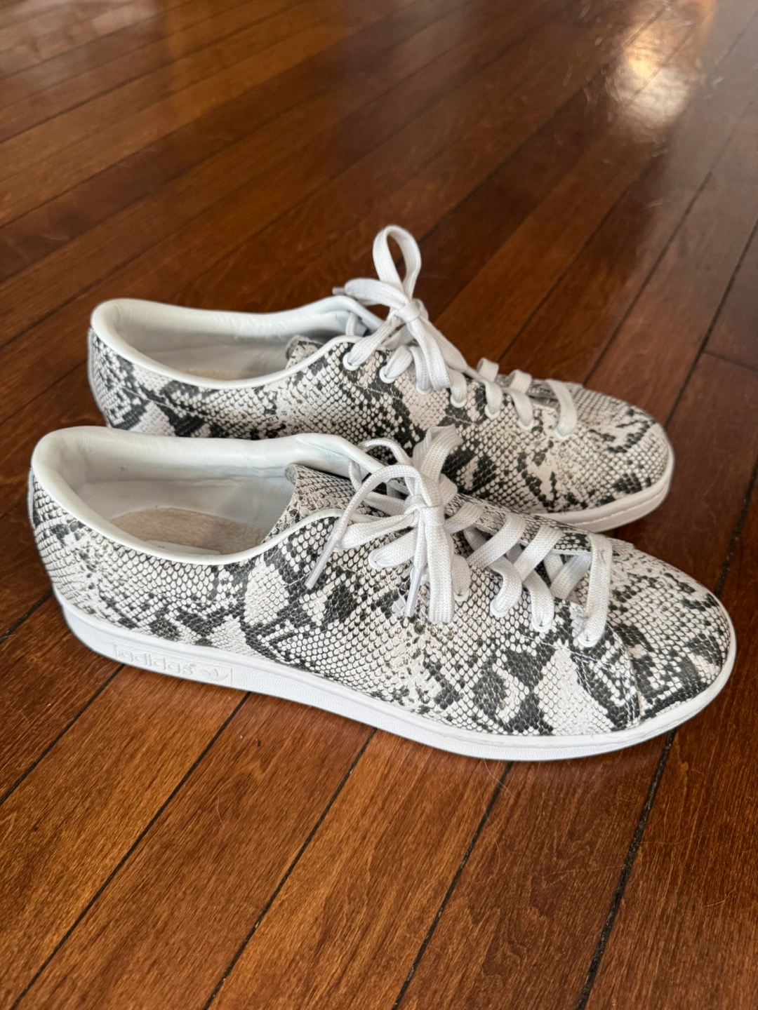 Selling a pair of Adidas x HYKE Stan Smith sneakers with a cool python print! They're in great condition and ready for a new home. These shoes feature the classic Stan Smith silhouette with a unique twist from HYKE, making them a stylish addition to any wardrobe. Men’s. Size 11.5.