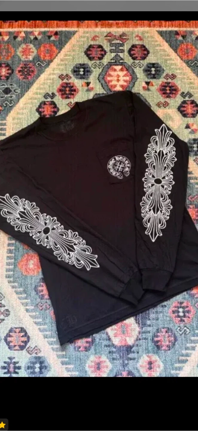 Selling a black long sleeve shirt from Chrome Hearts. It features the brand's signature cross design on the sleeves and chest. The shirt is in great condition and ready for a new owner!