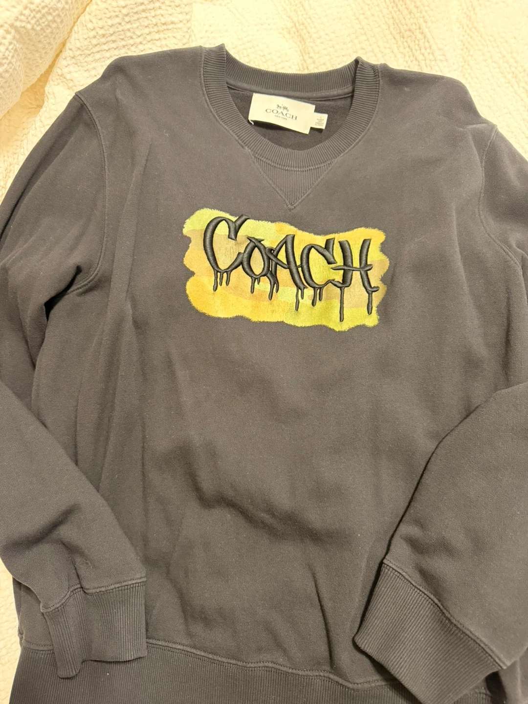This is a Coach crewneck sweatshirt .It features a graphic embroidered 'Coach' logo across the front. Made of a soft cotton blend, this sweatshirt offers a comfortable fit. It's a size large.
