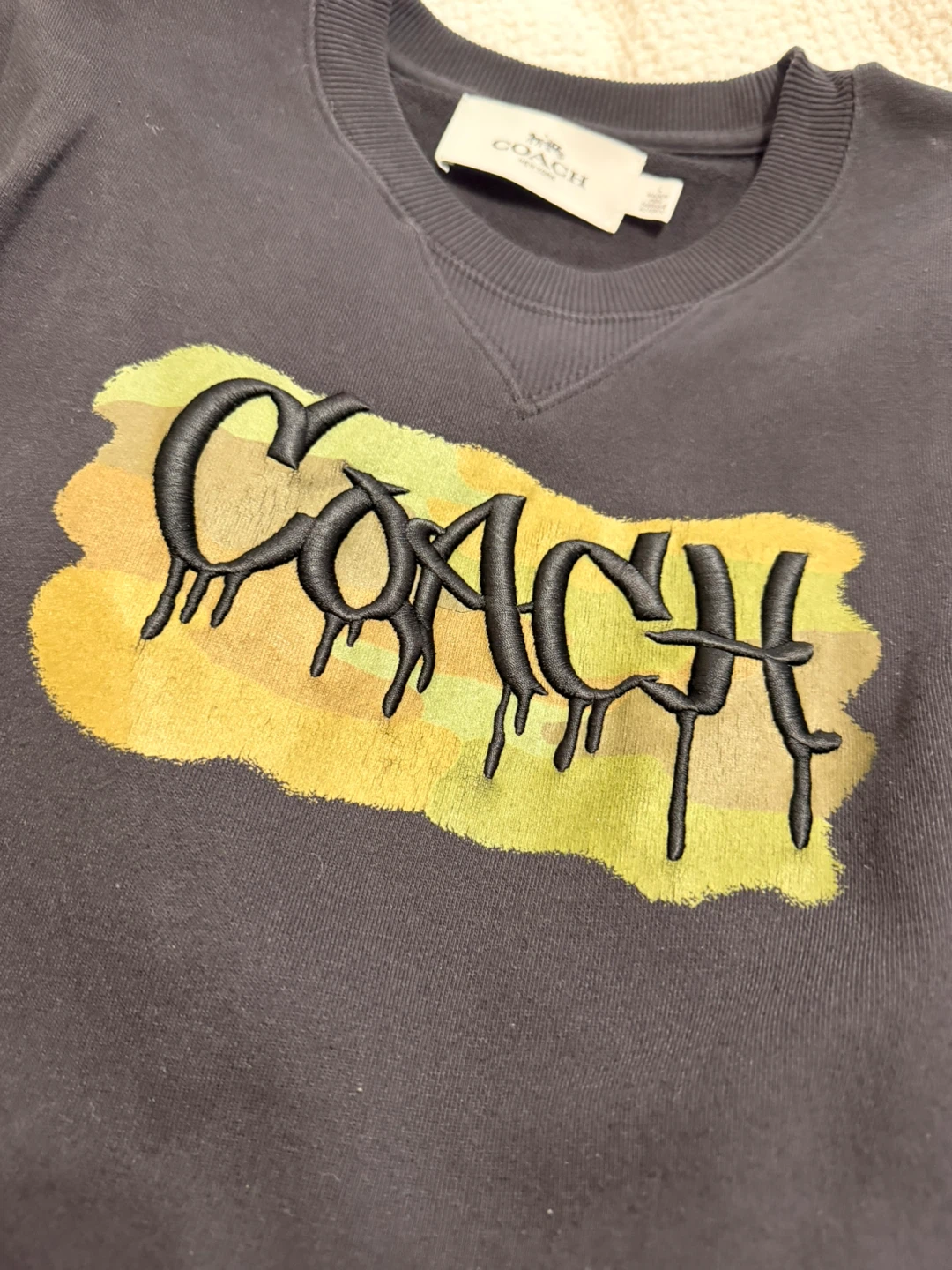 This is a Coach crewneck sweatshirt .It features a graphic embroidered 'Coach' logo across the front. Made of a soft cotton blend, this sweatshirt offers a comfortable fit. It's a size large.