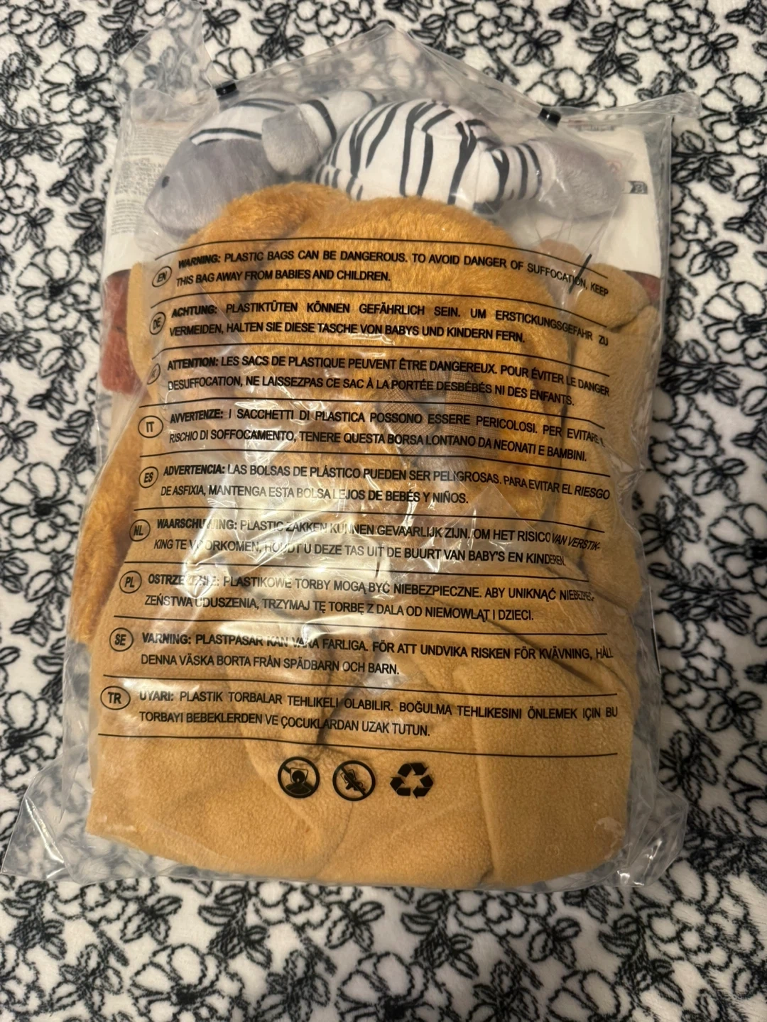 This baby lion costume includes a plush lion jumpsuit, a lion hat, a pair of lion booties, and a plush toy zebra. It's designed for ages 12-18 months. It's perfect for Halloween or dress-up play!