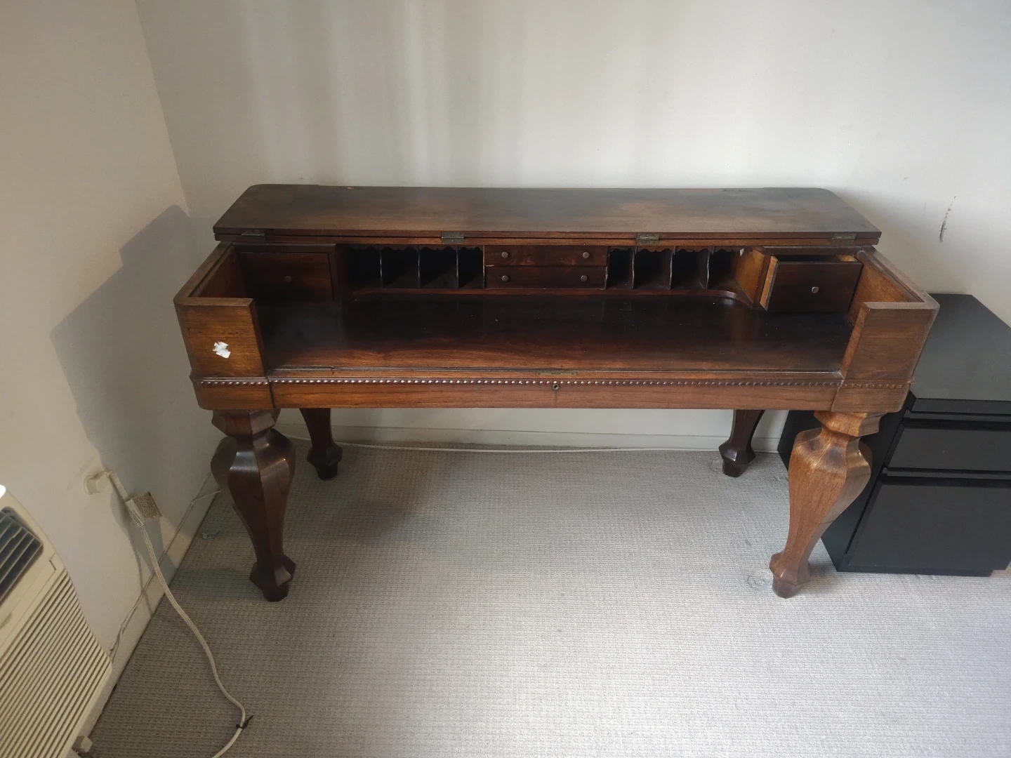 Selling a beautiful antique wooden desk. It has a unique design with detailed legs and a flip-top surface that reveals compartments for storage. Perfect for adding a touch of vintage charm to your home office or study!