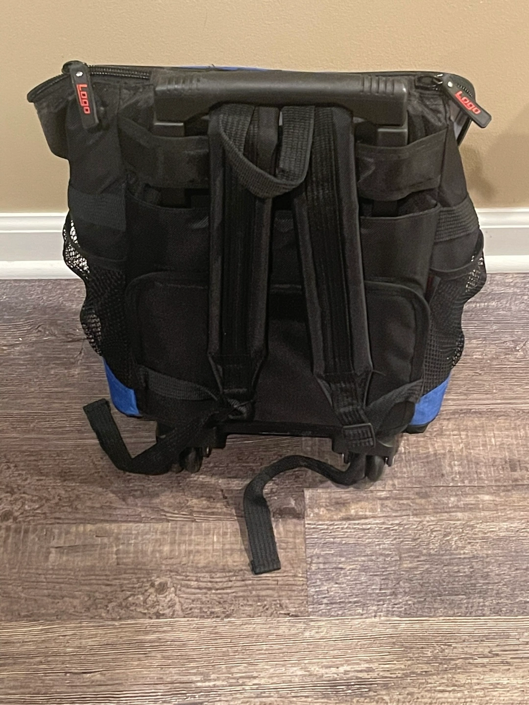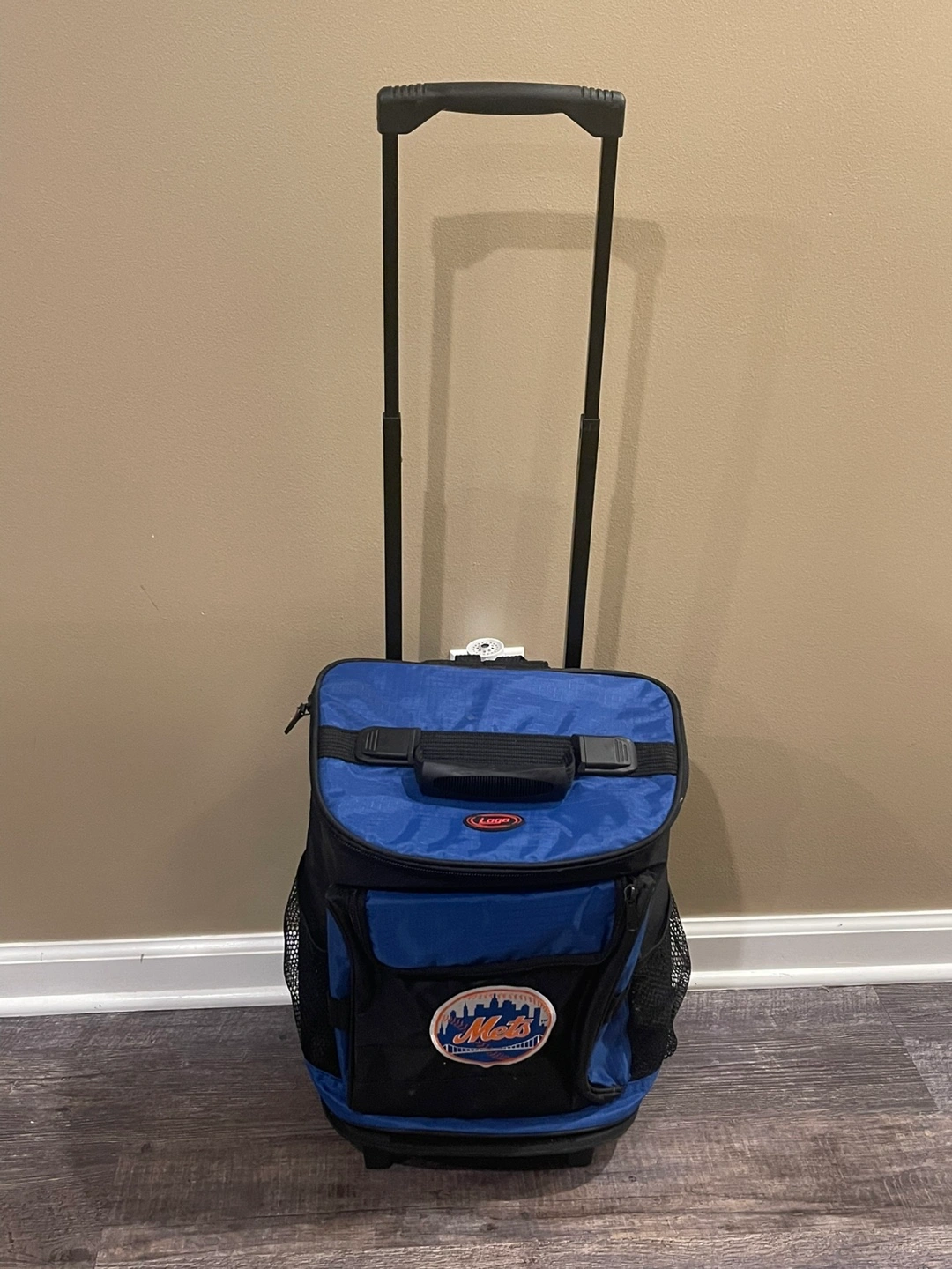 Rolling cooler backpack. Features backpack straps and wheels. Insulated main compartment. New York Mets logo. Ideal for sporting events or picnics.