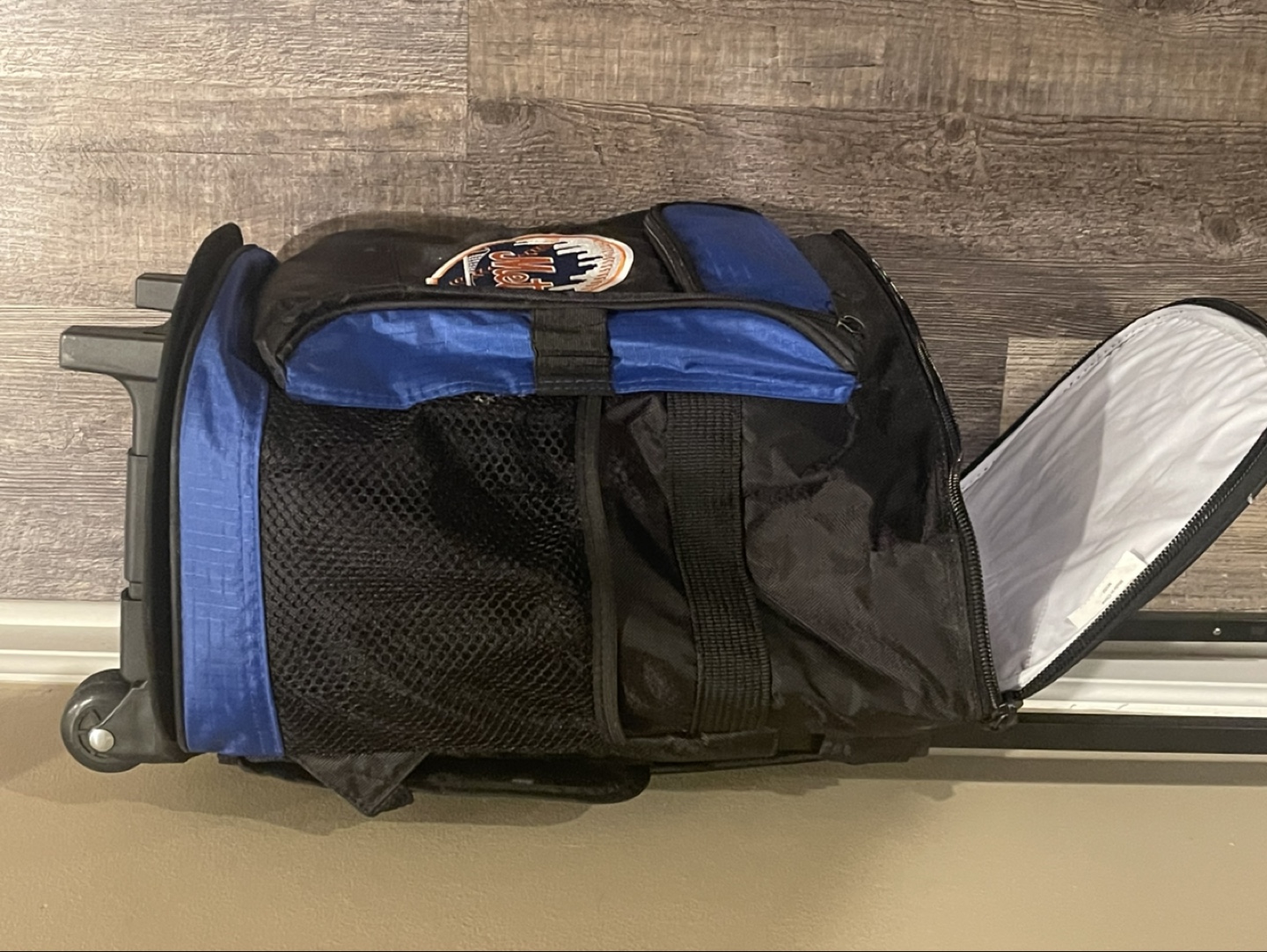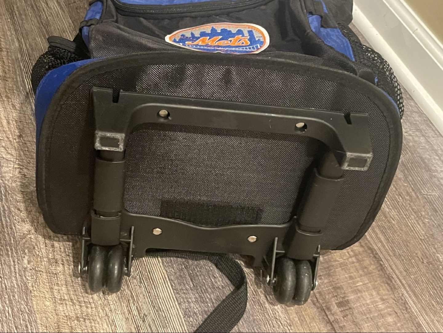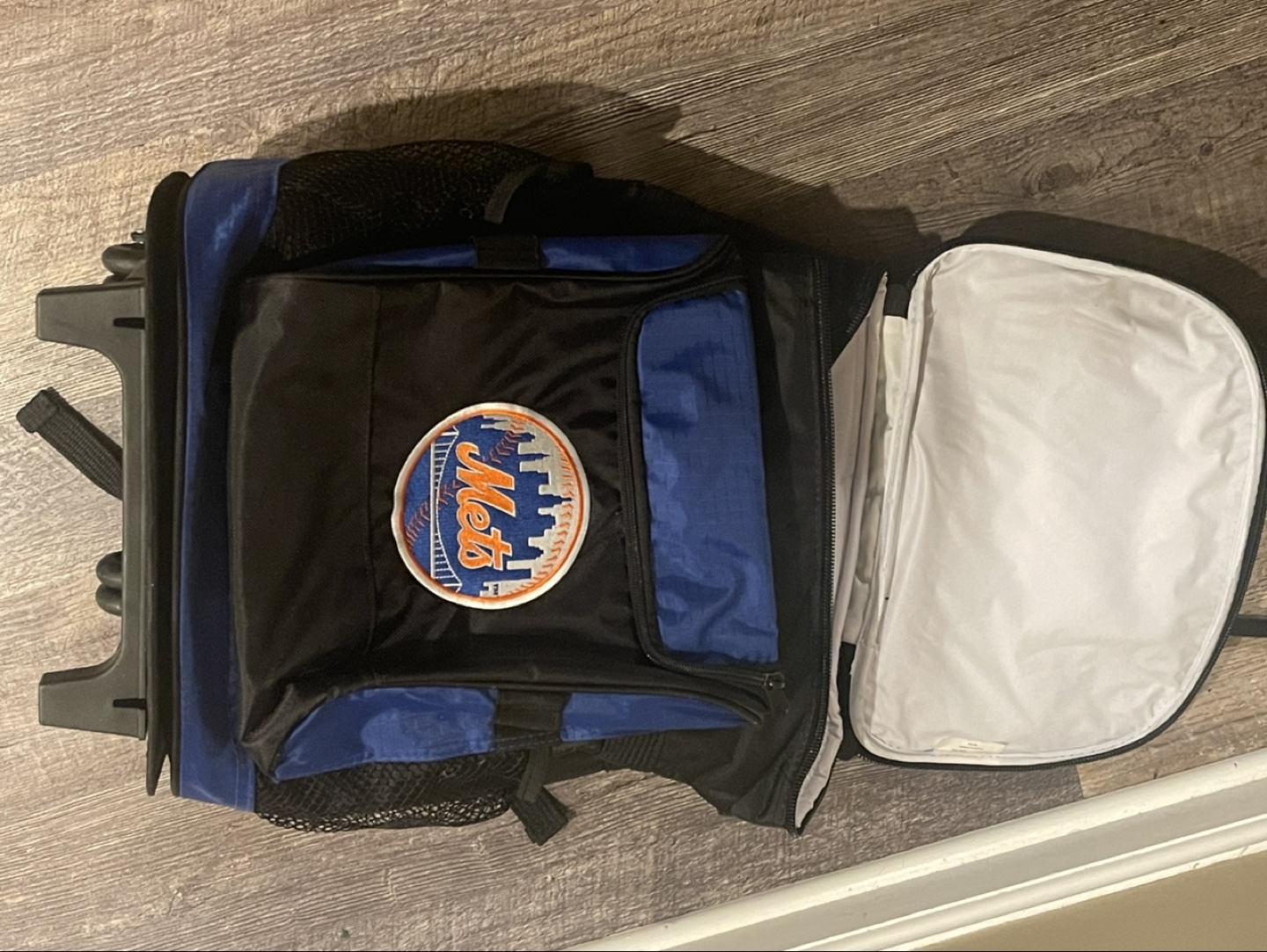 Rolling cooler backpack. Features backpack straps and wheels. Insulated main compartment. New York Mets logo. Ideal for sporting events or picnics.