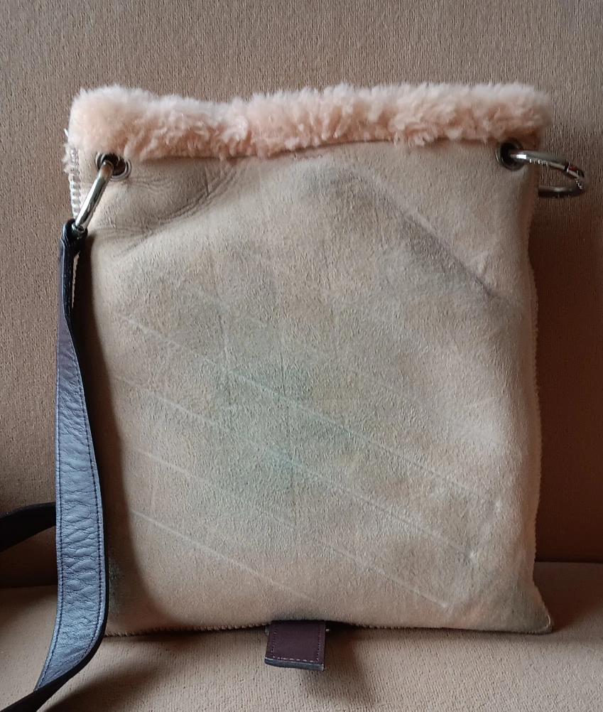 Adorable crossbody bag. Pink Suede exterior with shearling trim. Brown leather accents and strap. Pre-owned. Good condition but faded.