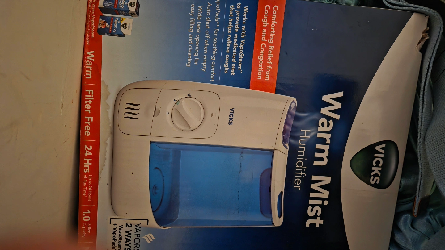 Selling a Vicks Warm Mist Humidifier that provides comforting relief from cough and congestion! It works with VapoSteam to provide medicated mist and helps relieve coughs. The humidifier also works with VapoPads for soothing comfort and has an auto shut off when empty. It has a wide tank opening for easy filling and cleaning and can run for up to 24 hours!