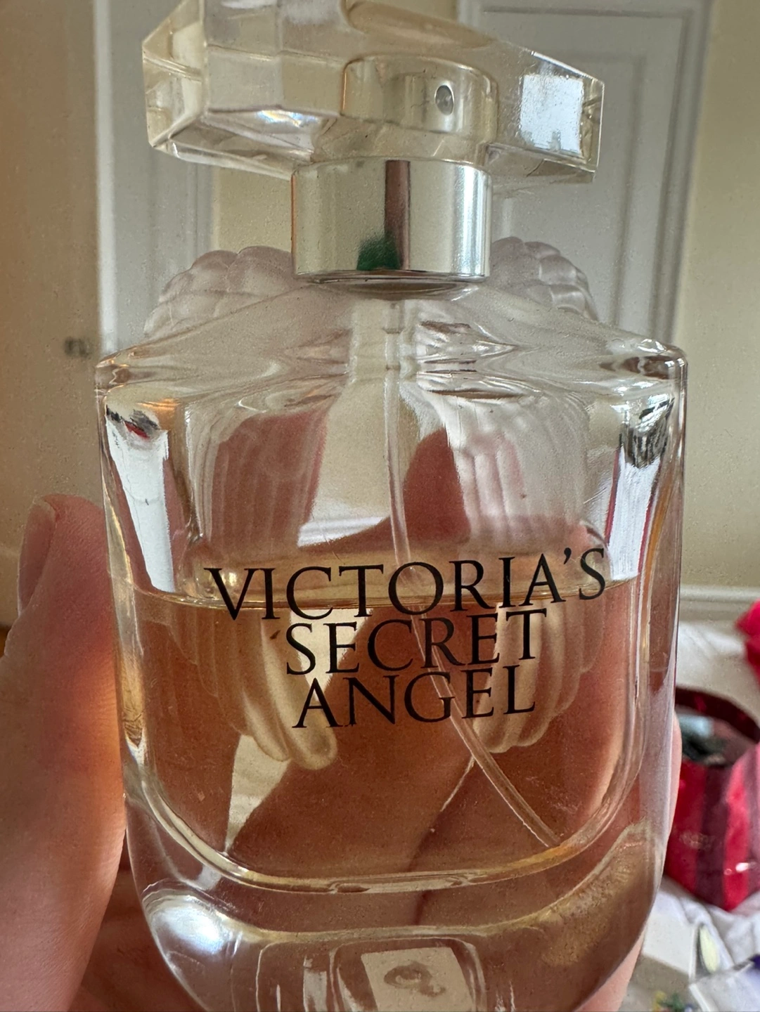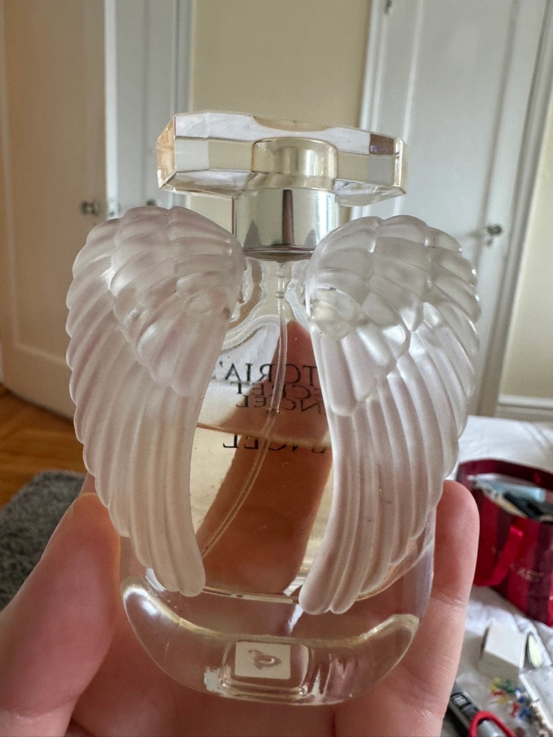128Angel perfume by Victoria's Secret. Glass bottle with frosted wings. Some liquid remaining.