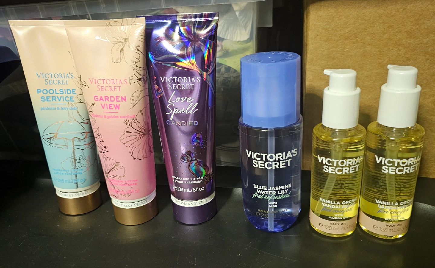 Selling a lot of Victoria's Secret body care products! Includes body lotions, body oils, and body mist. The body lotions are 236 mL/8 fl oz, the body oils are 128 mL/4.3 fl oz, and the body mist is 250 mL/8.4 fl oz $9 each