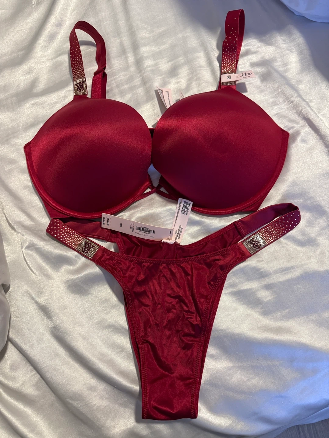 84Selling a beautiful Victoria's Secret Bombshall push-up bra and thong set in a stunning red color! The bra is a size 34DD and the thong is a size M. The set features sparkly embellishments on the straps and sides. Perfect for adding a touch of glam to your lingerie collection