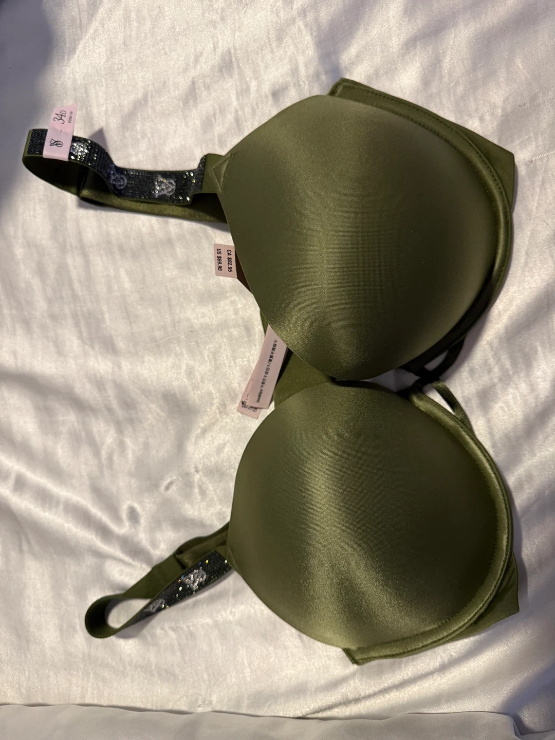 84Selling a Victoria's Secret Bombshall Push-up bra in olive green, size 34D! It's in great condition and ready for a new home