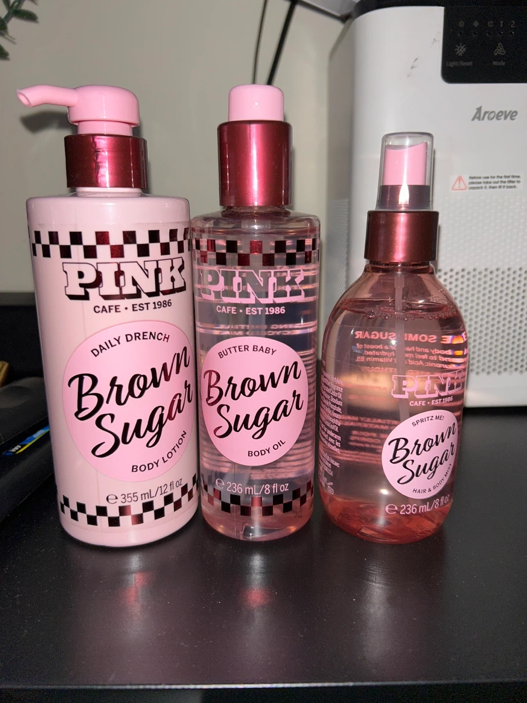 101Selling a set of Victoria's Secret PINK Brown Sugar products! Includes: - Daily Drench Body Lotion (355 mL/12 fl oz) - Butter Baby Body Oil (236 mL/8 fl oz) - Spritz Me! Hair & Body Mist (236 ml/8 fl oz)