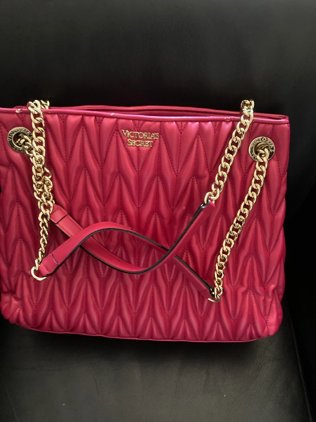 Selling a beautiful Victoria's Secret tote bag. It's a vibrant pink color with a quilted design and gold chain straps. Perfect for everyday use!