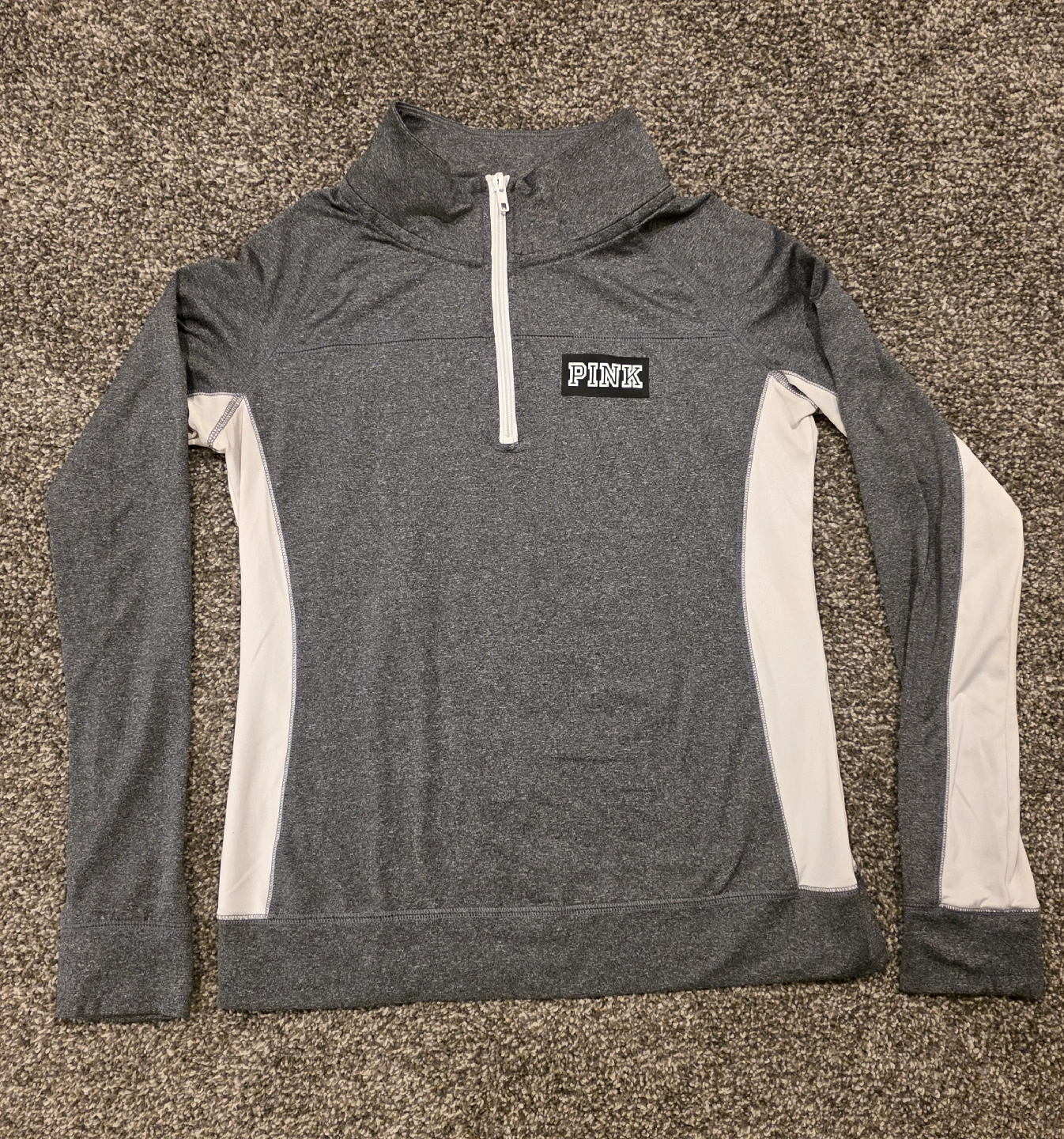 Selling a PINK Ultimate half-zip pullover in size medium! It's a stylish gray color with white accents. Perfect for layering or wearing on its own. The material is a comfortable blend of polyester and elastane for a great fit and fee Pick up in Naperville near naper blvd and 87th street or near downtown Naperville off of Chicago and Charles l