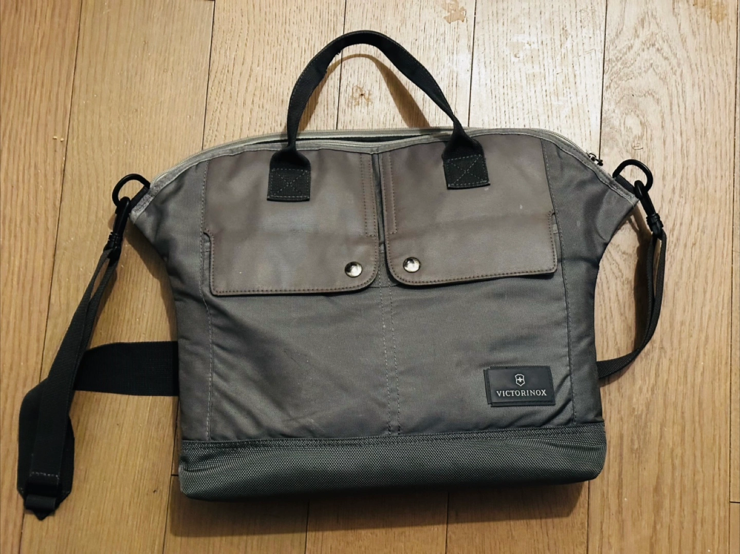 20Gray fabric laptop bag. Top handles and adjustable shoulder strap. Exterior zipper closure and front pocket. Brand logo visible.