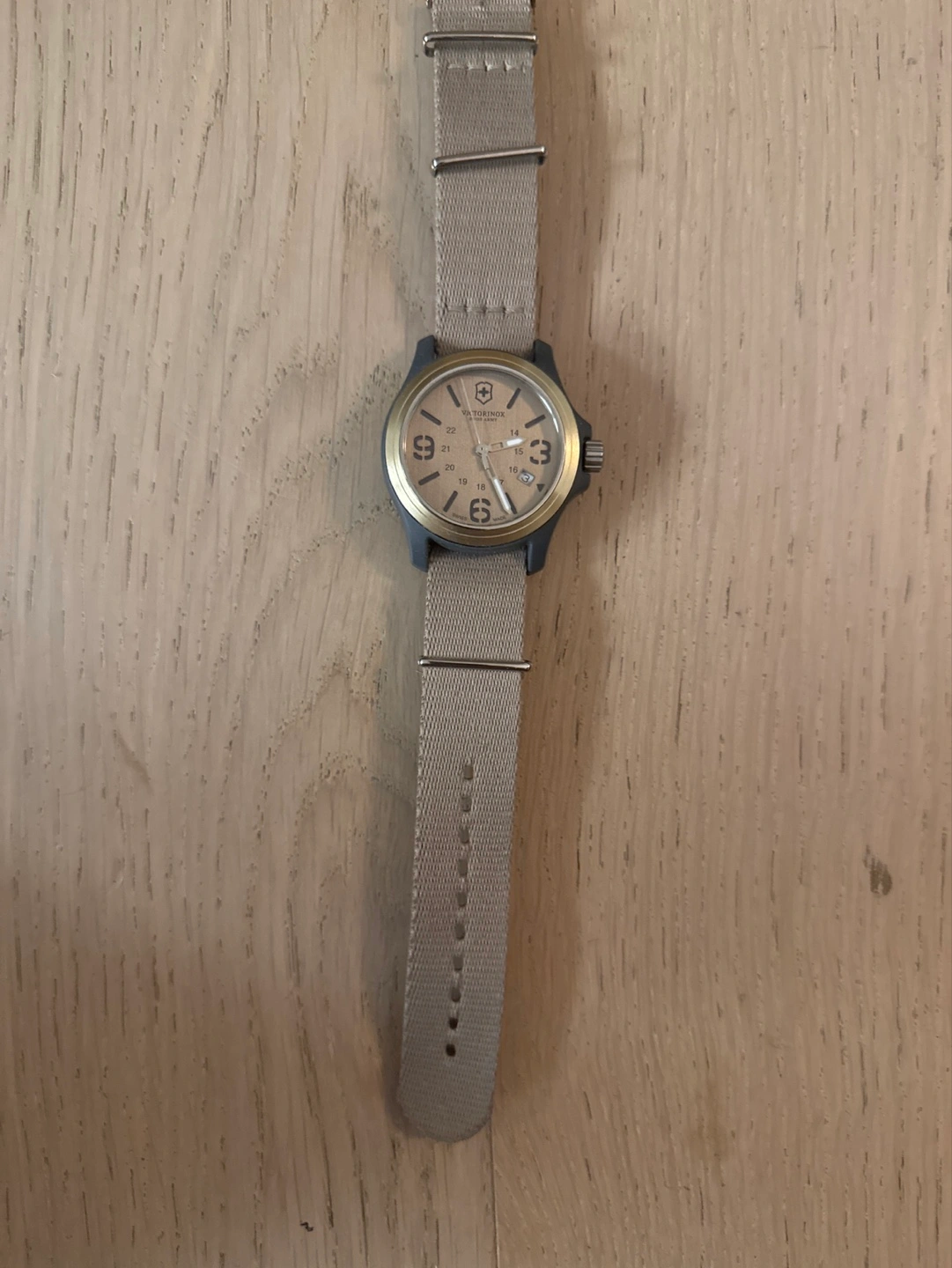 Wristwatch, beige nylon band, round face. Analog. Needs new battery.