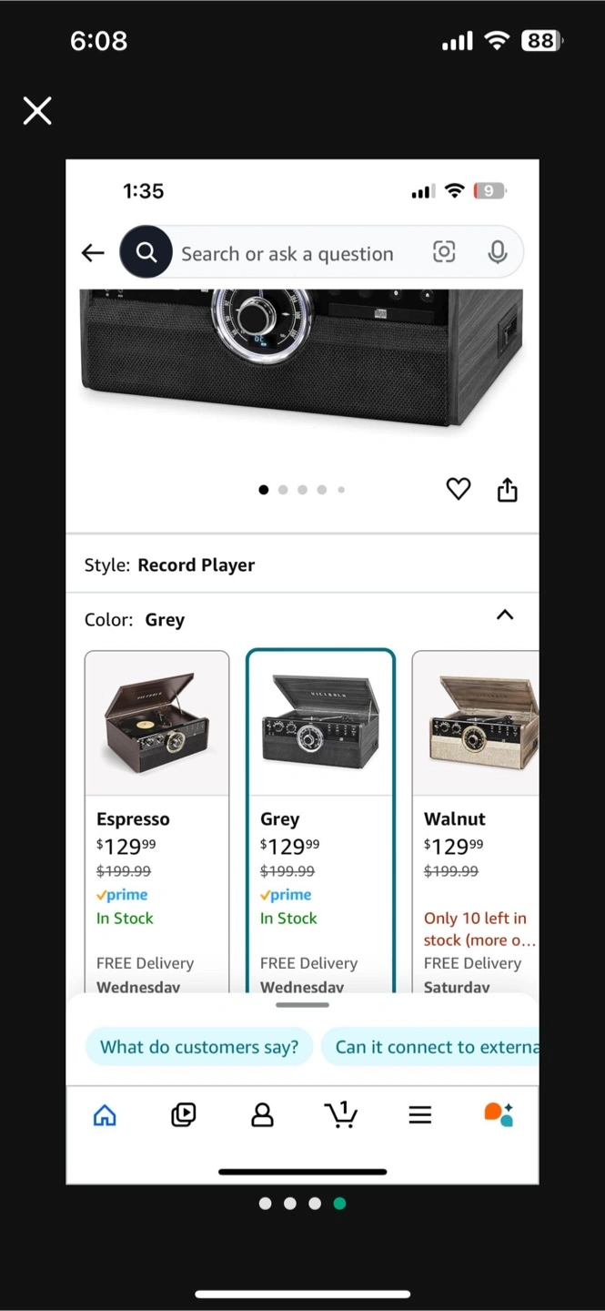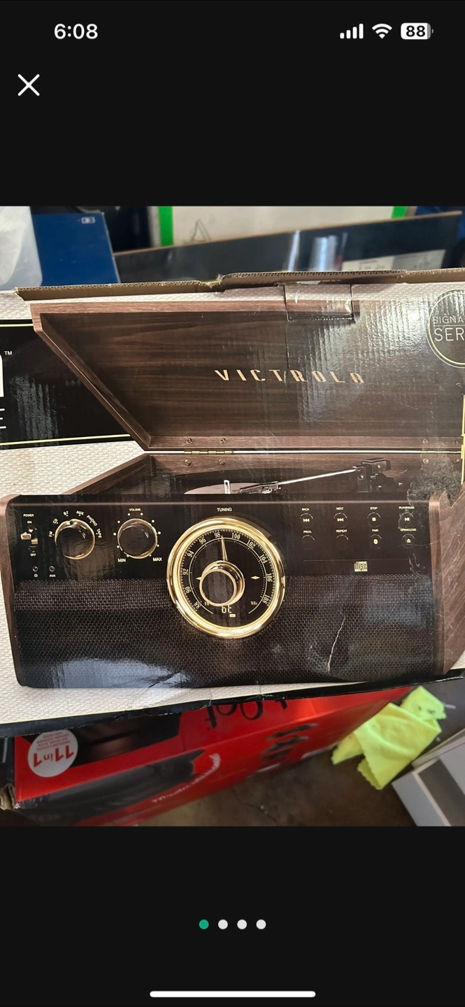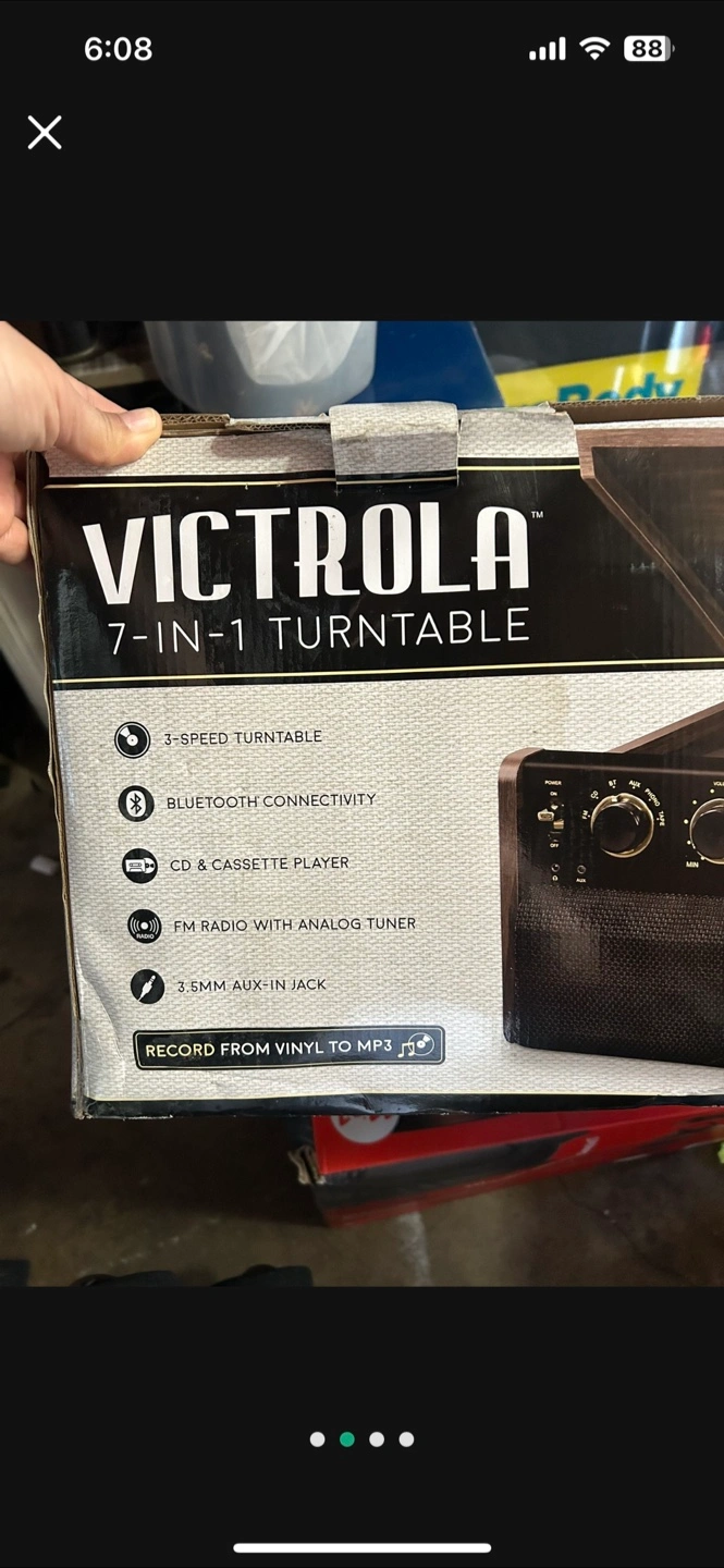 Selling a Victrola 7-in-1 Turntable in grey! It's in great condition and comes with the original box. Features include: - 3-speed turntable - Bluetooth connectivity - CD & cassette player - FM radio with analog tuner - 3.5mm AUX-in jack - Record from vinyl to MP3