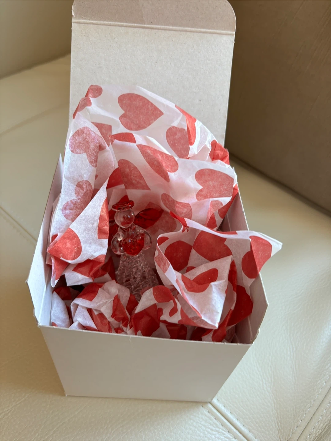 A charming clear glass angel figurine with red glass wings and heart. It's beautifully crafted and sits on a small mirror base. Comes packaged in box with heart tissue paper ❤️. It’s 3 1/2 inches high with a 2 1/2 inch diameter.