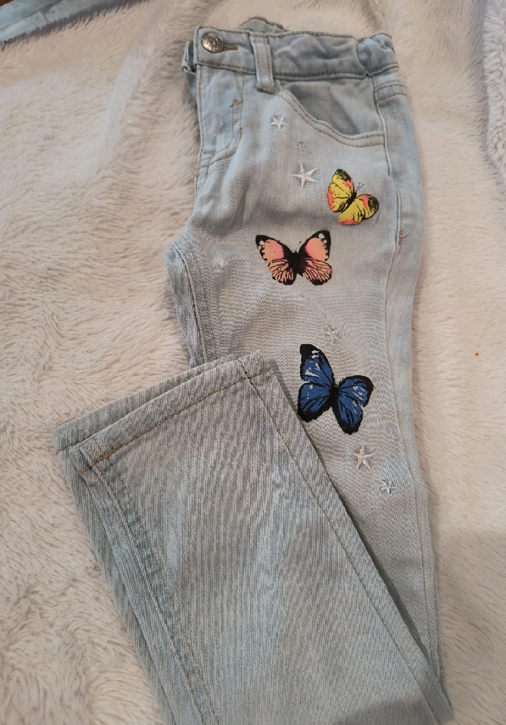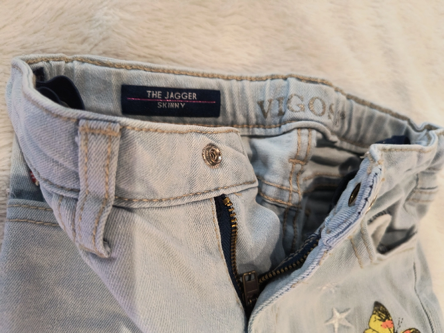 65These are a cute pair of Vigoss The Jagger skinny jeans in a size 6! They feature butterfly designs and are made of 70% cotton, 20% polyester, 8% rayon, and 2% spandex