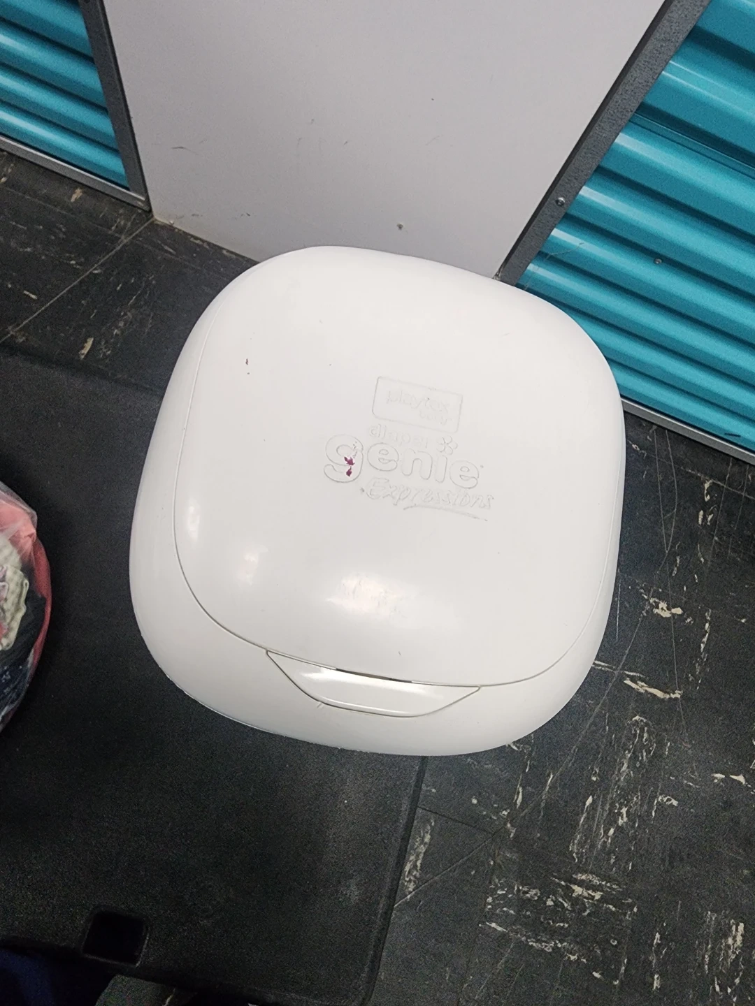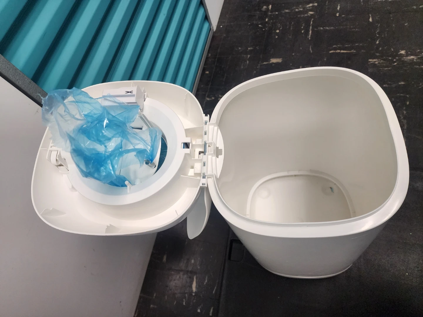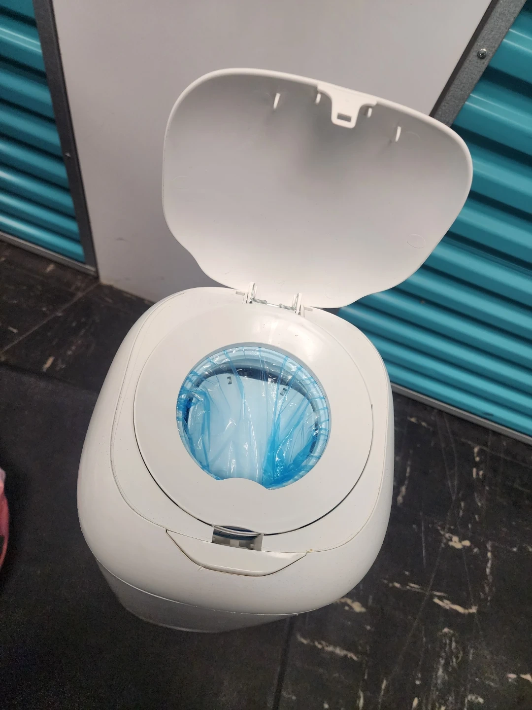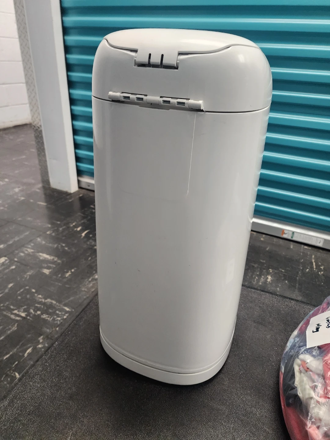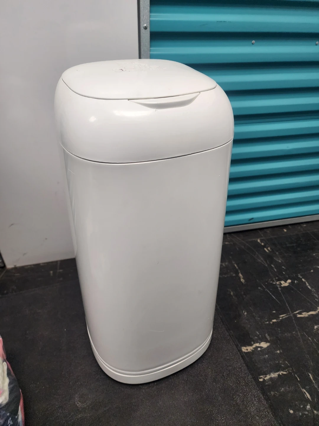 This Playtex Diaper Genie Expressions diaper pail helps control odors. It's white and made of plastic. The pail features a foot pedal for hands-free operation.